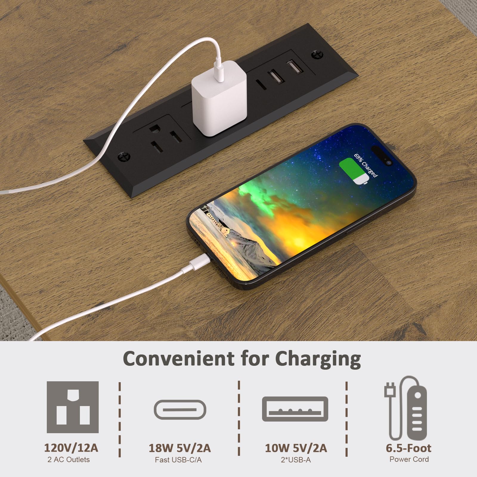- End Table with Charging Station-Boasting a spacious 24" square desktop, this design accommodates your laptop, smartphone, lamp, and other daily essentials comfortably without feeling cramped. The tabletop of this large end table for living rooms features conveniently integrated power outlets, including 2 standard AC sockets, 1 PD Type-C USB port, 1 QC (3.0), and 1 USB port, eliminating the hassle of searching for charging outlets.