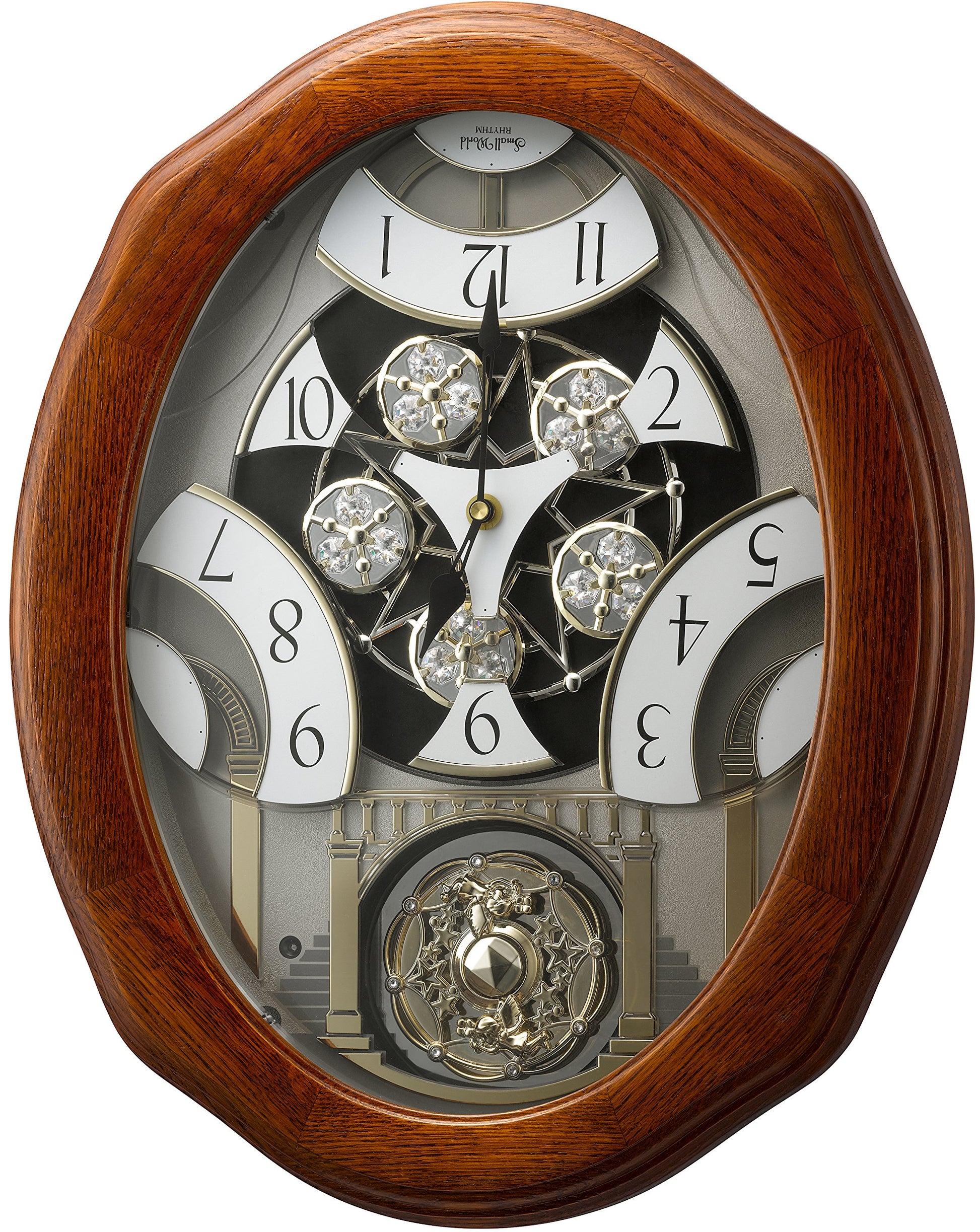 - Along with the continuously spinning crystal encrusted pendulum and opening face, on the hour this clock also coordinates this movement with a selection of one of 30 melodies including 12 popular melodies, 12 classic melodies and 6 Christmas songs