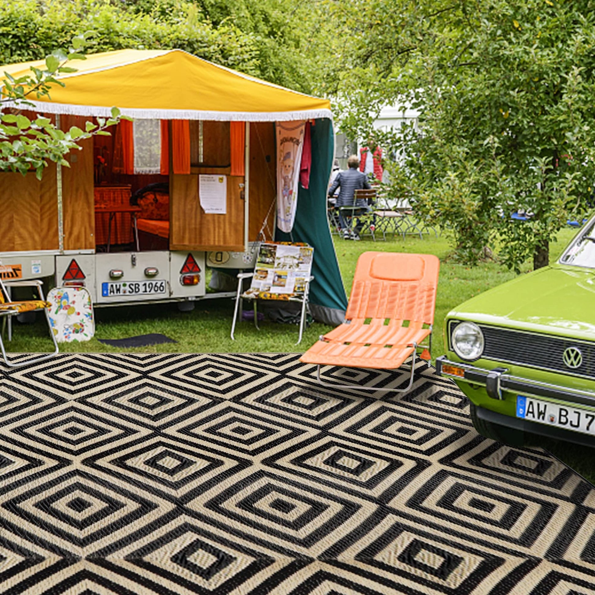 - EASY TO CLEAN & PORTABLE -- This outdoor patio rug is easy to clean, just simply sweep away dirt or spray it with water, and dry it in air. This outside rugs also can be folded into compact size for easy storage, it comes with a carrying bag for easy transport, suitable for beach trips, afternoon outing, camping, barbecue picnic or an RV road trip.