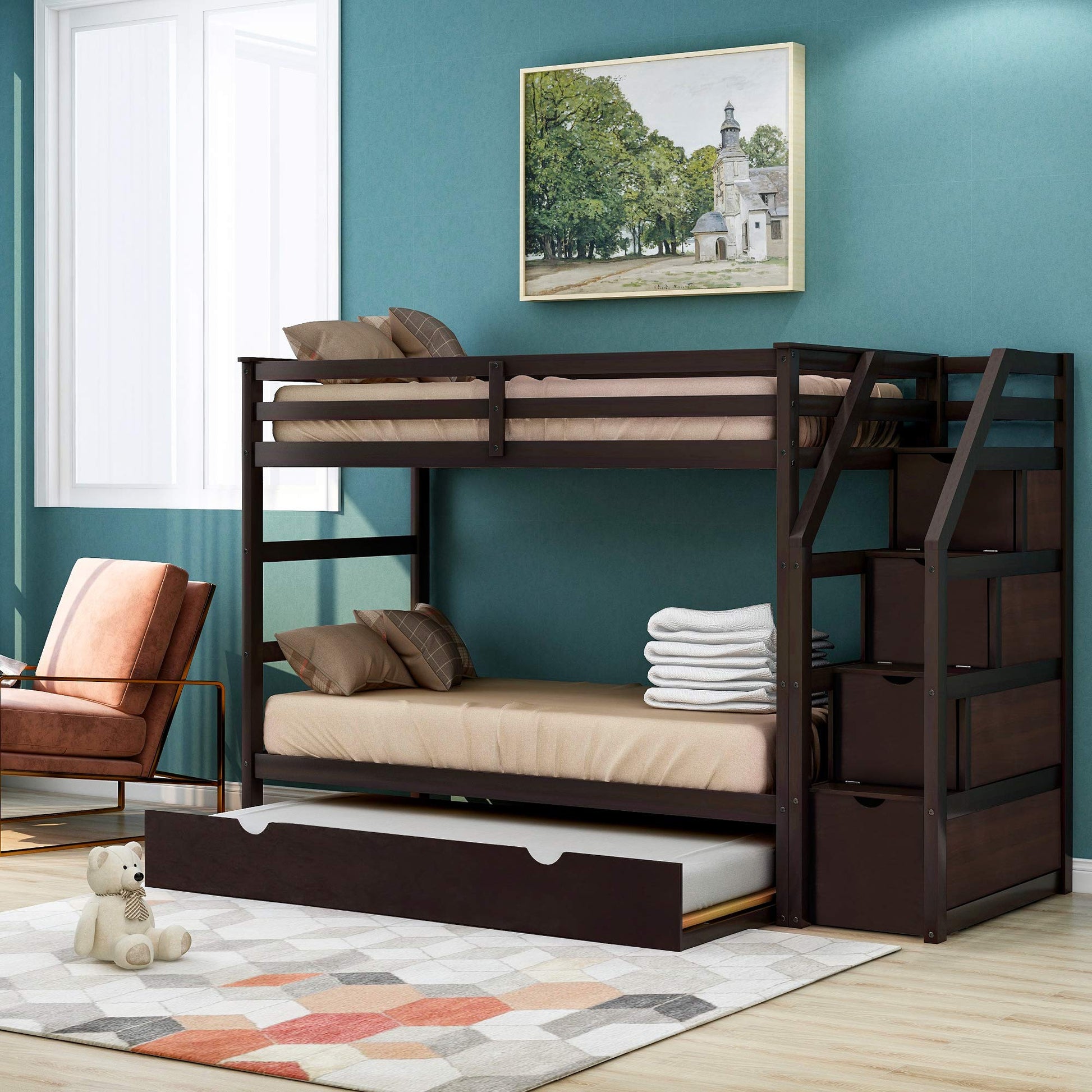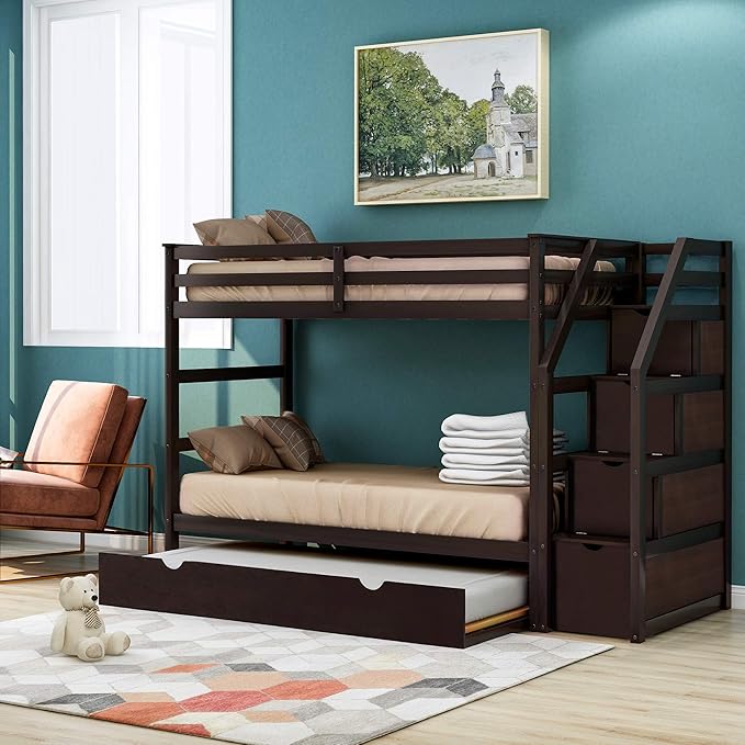 Twin Bunk Beds, Premium Wood Twin Over Twin Bunk Bed Frame with Trundle and Storage Stairs