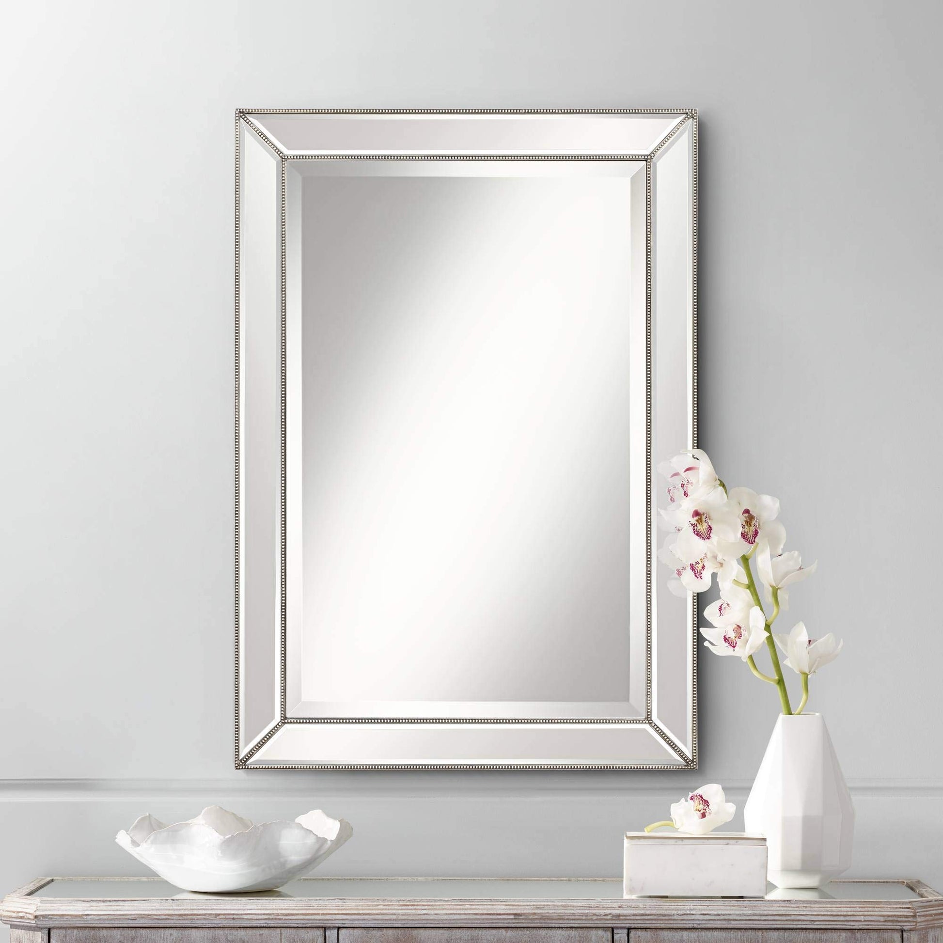 Vanity Decorative Wall Mirror Modern Doubled Beaded Border Silver