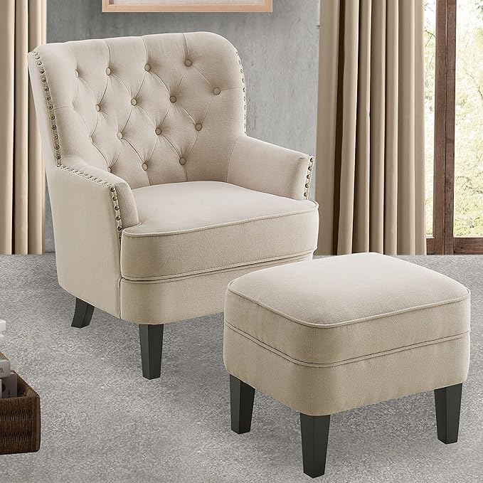 - LONG-LASTING DURABILITY: Choose lasting quality with our tufted armchair and ottoman, crafted from premium materials and featuring a reinforced frame for exceptional durability. Unlike other sets that wear down quickly, ours is designed to endure daily use while retaining its stylish look. Perfect for both busy spaces and quiet nooks, this set is a timeless addition to your home.