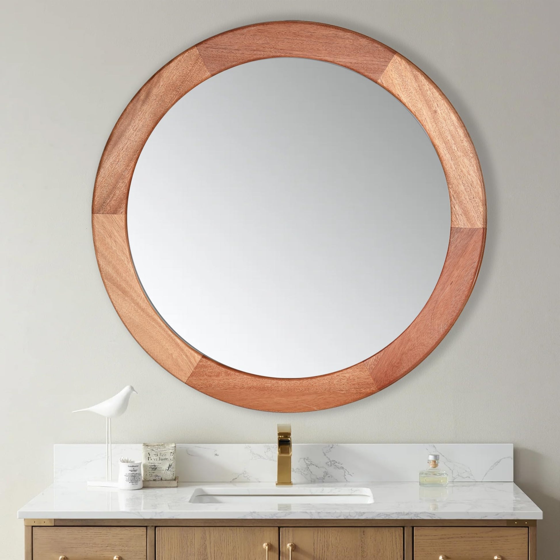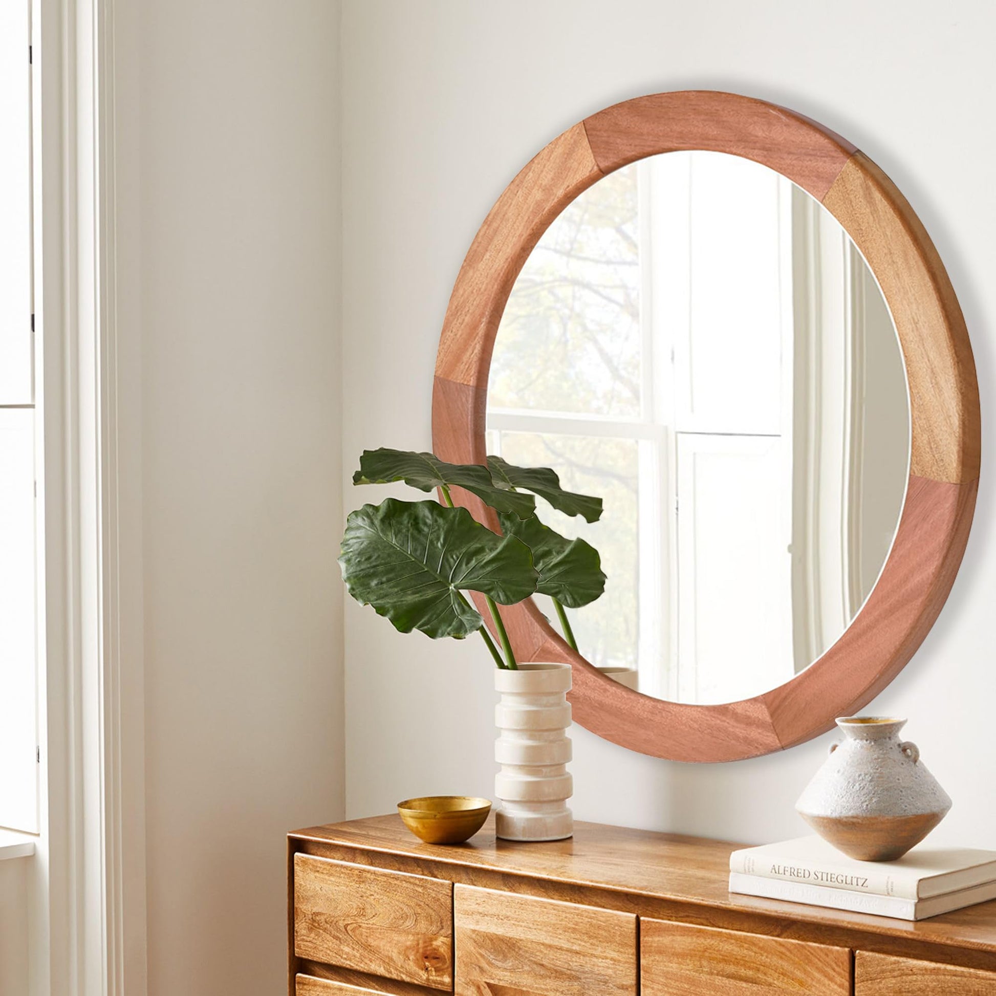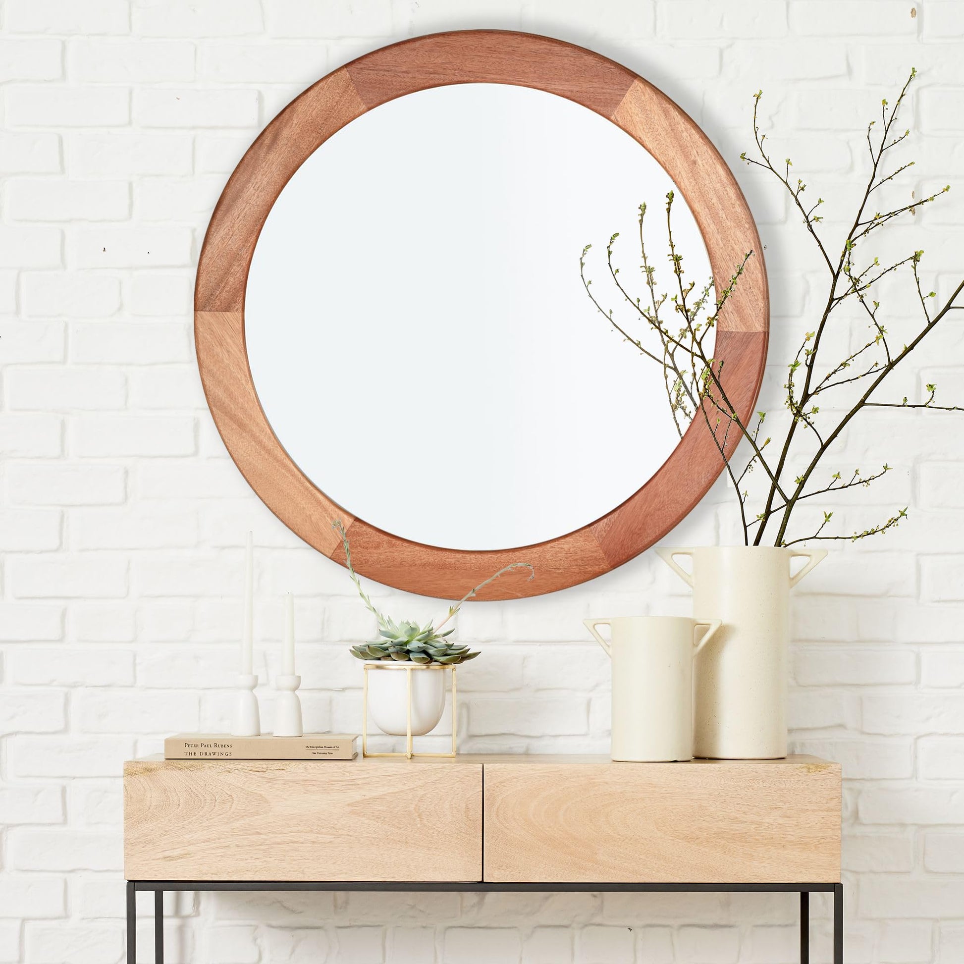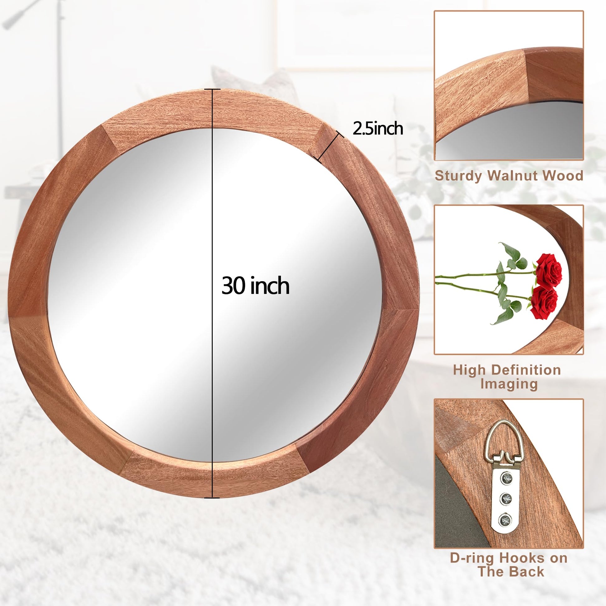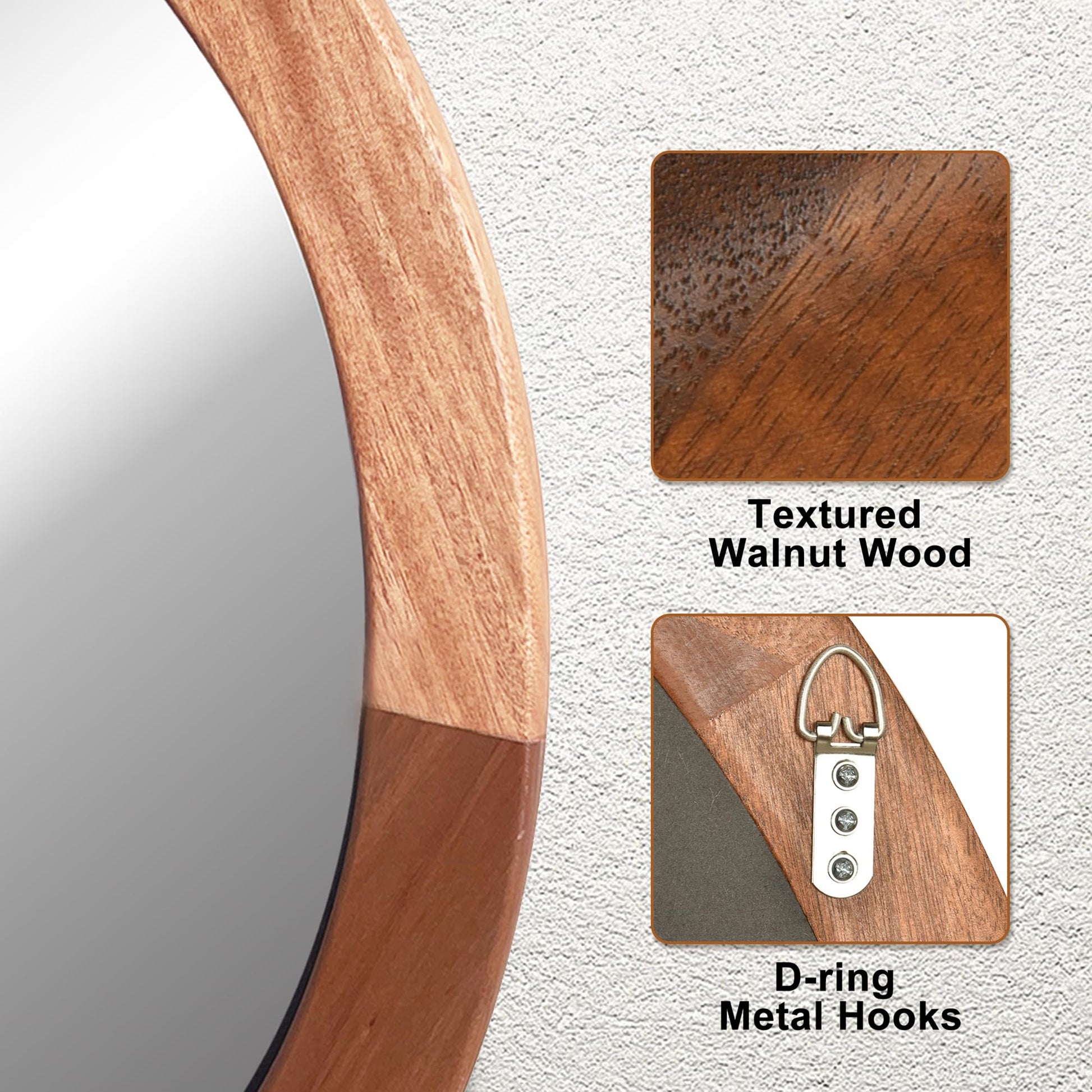 - The wooden wall round mirror is easy to be installed within minutes. It comes with two D rings hooks on the back.To be sure it securely attached on the back.
