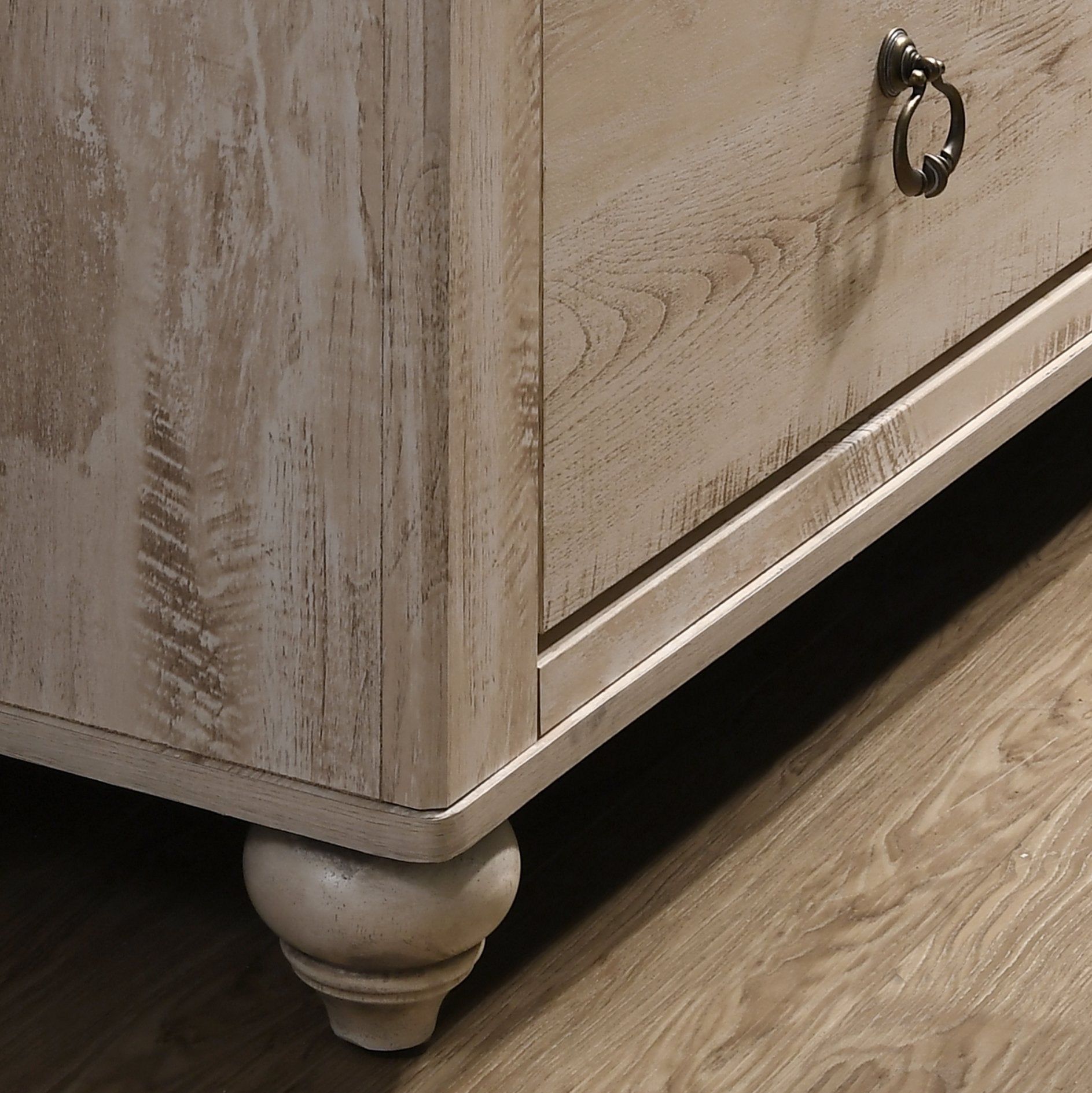- Rustic, urban chic style dresser with white wash finish, contrasting with the delicate metal ring and nob handles