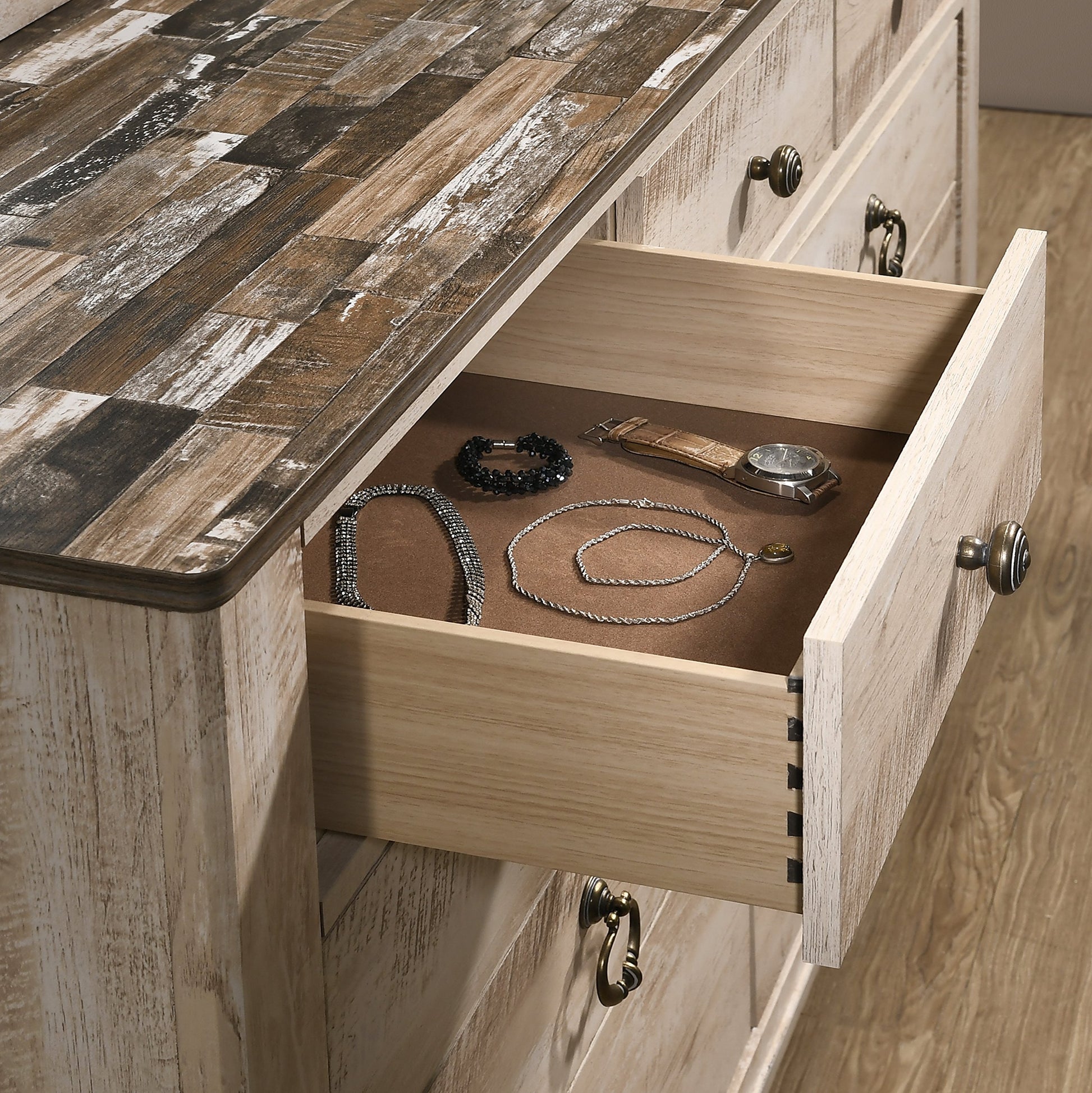 - Top of the dresser features a patched wood pattern design with distressed antique walnut brown colors