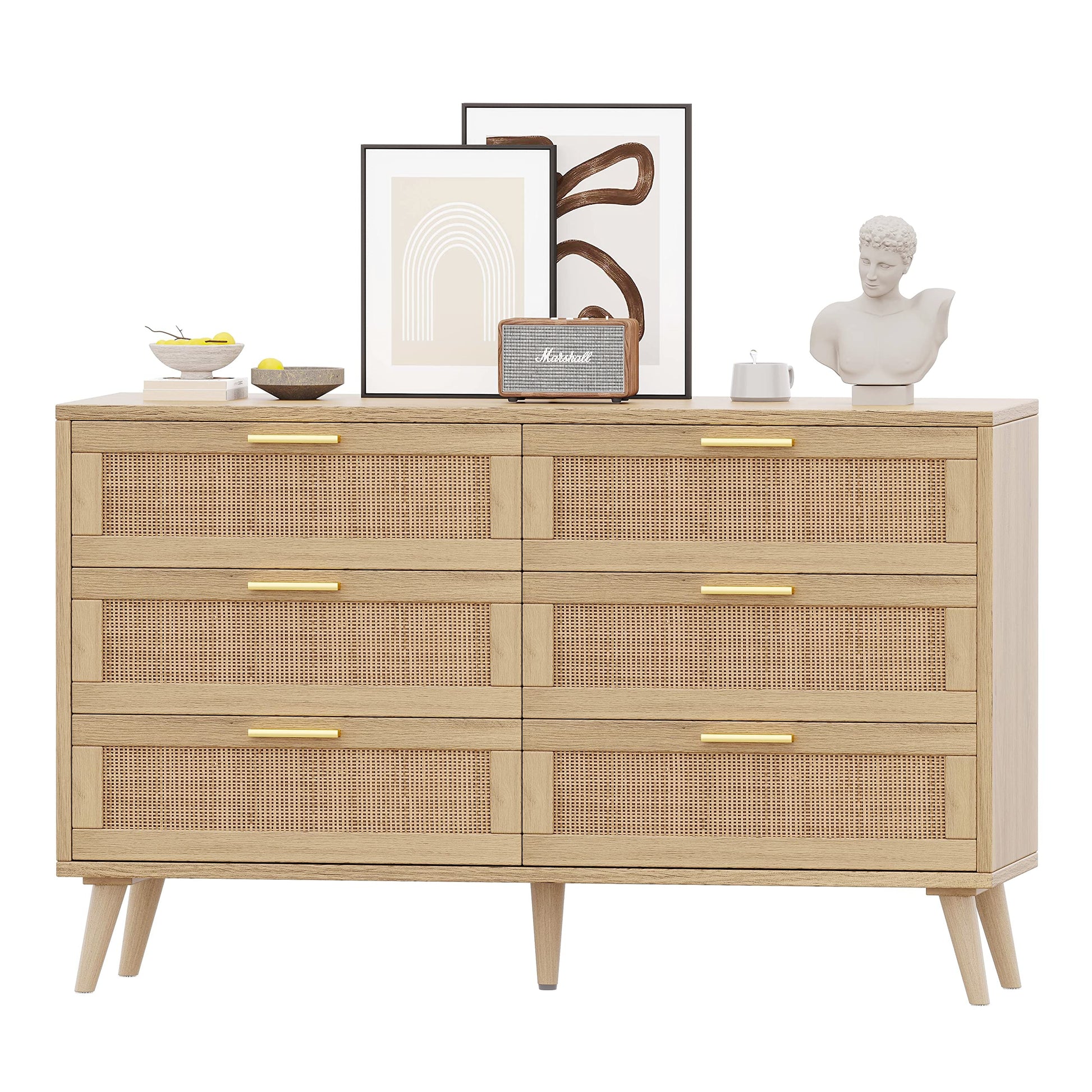 - Equipped with woven rattan, while angled legs and golden handles, the drawer dresser will add a mid-century charming to your home. Use on its own or pair it with other rattan matching pieces from Airbuyhome