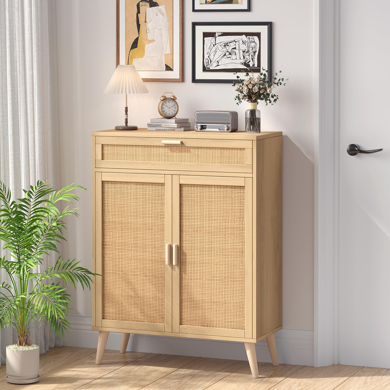 Accent Floor Storage Cabinet with Rattan Doors, Bathroom Cabinet with Large Drawer, Freestanding Storage Cabinet Organizer, Natural BMGZ107M