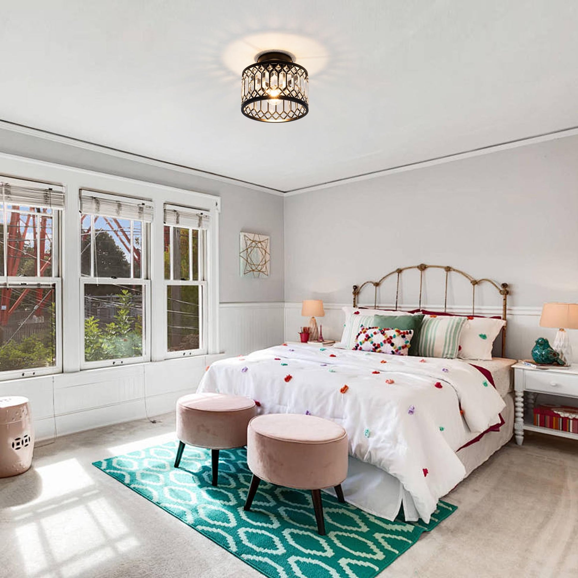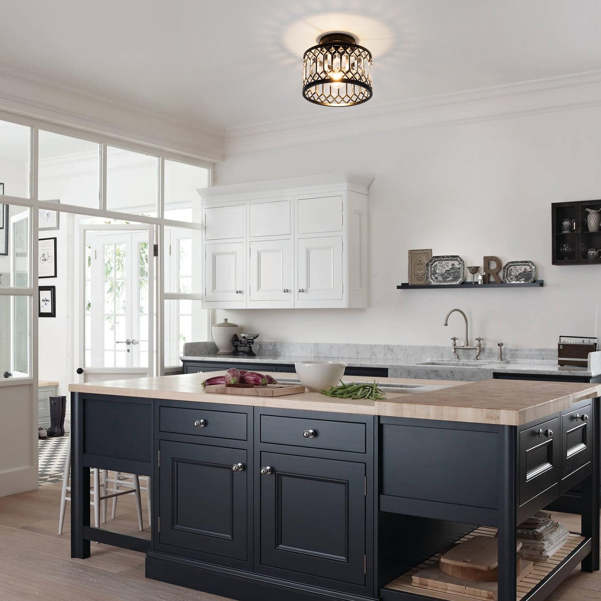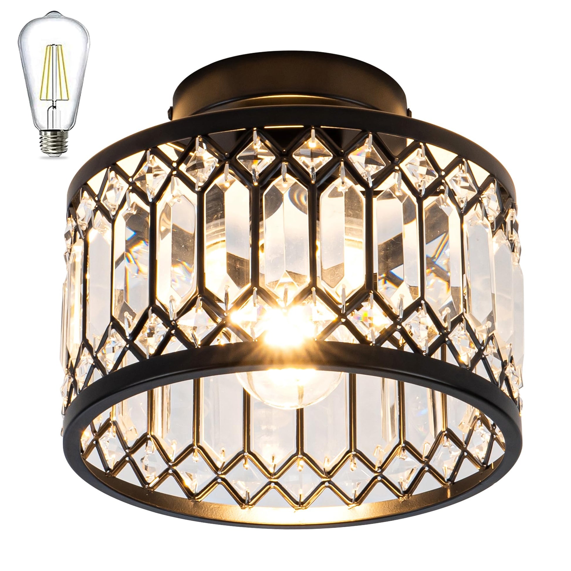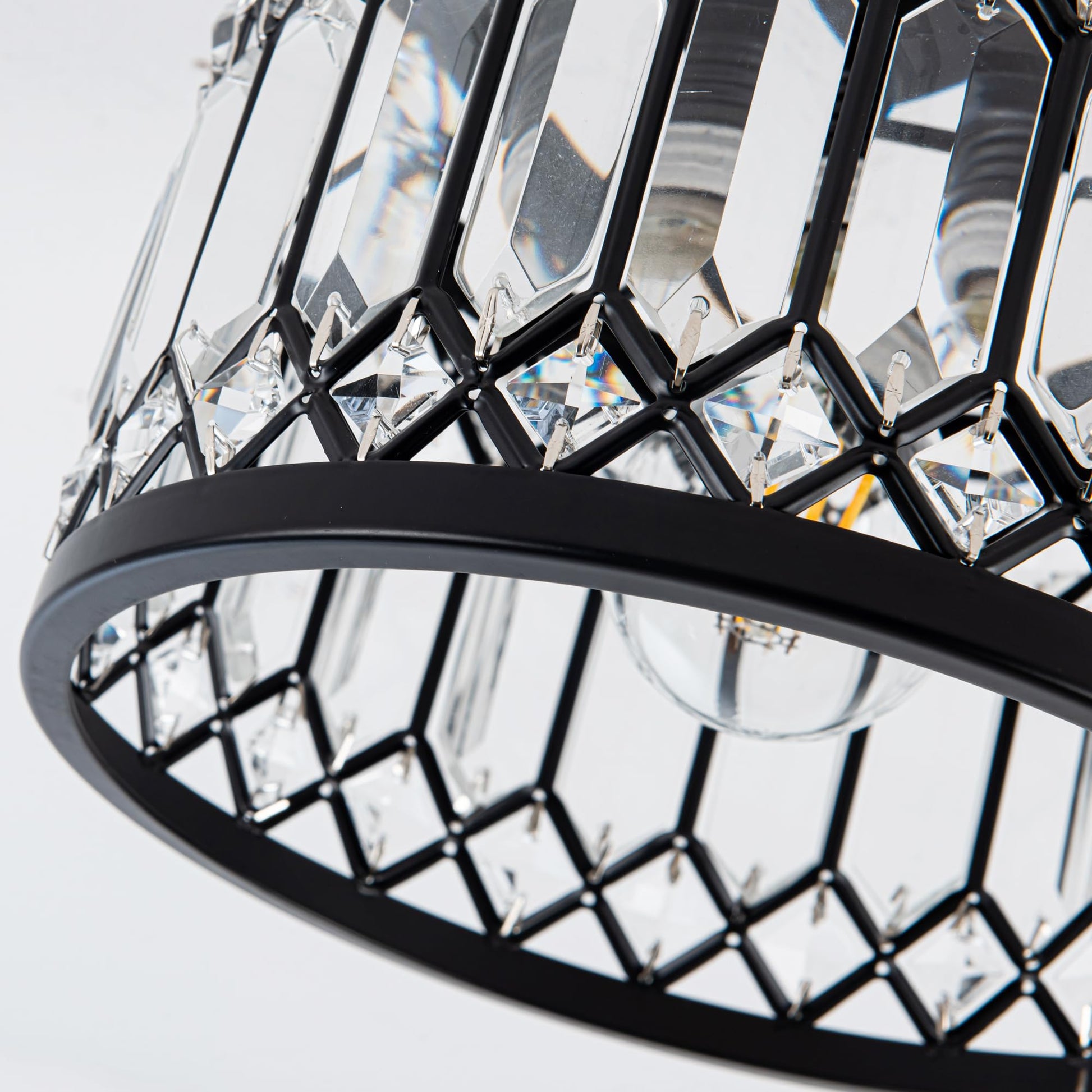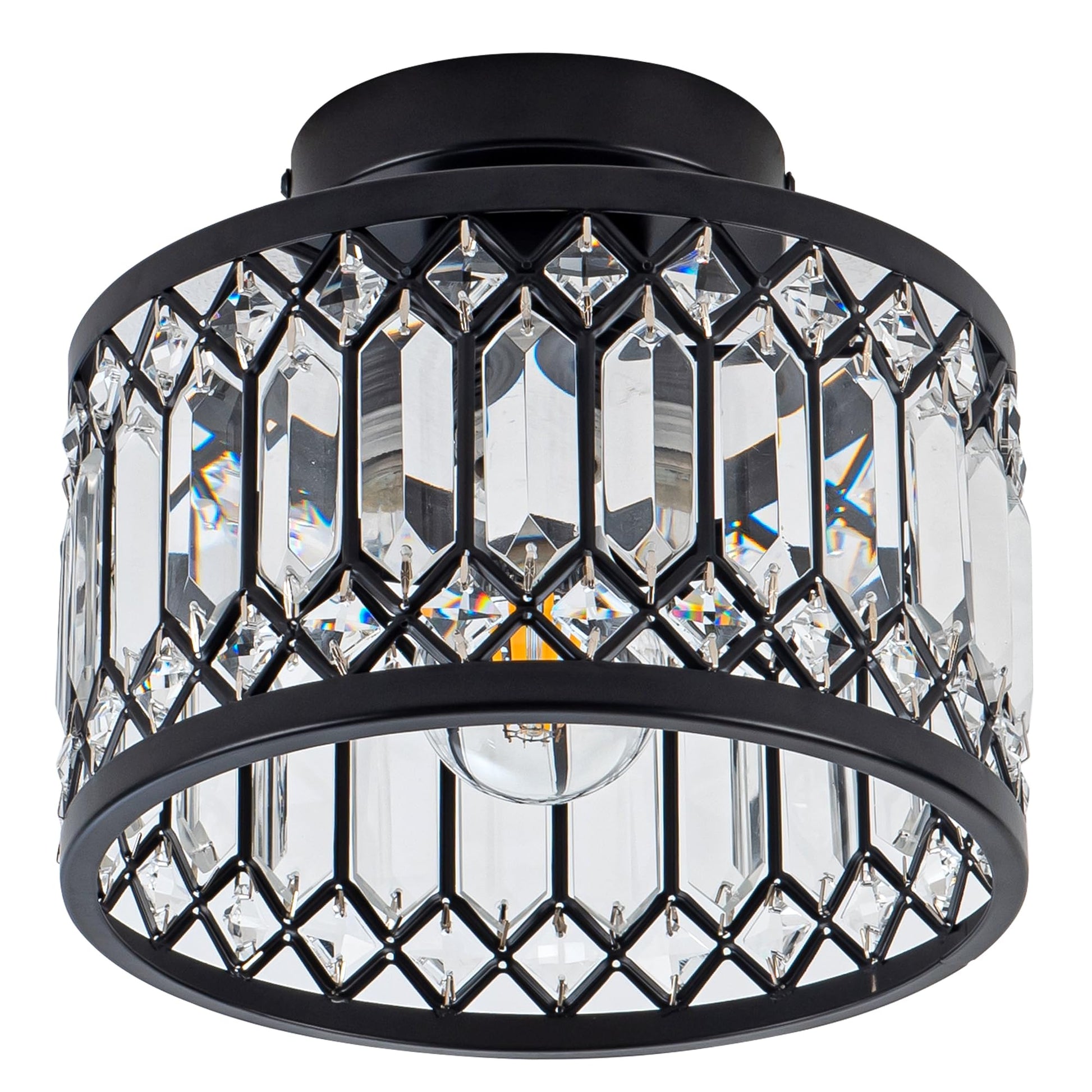 - This Modern Flush mount ceiling light features Black frame with crystal shade.The round metal construction and clear crystal decoration make this modern crystal chandelier simple and luxurious yet elegant,while also reflecting the colorful light around the room in a clever way. Creating a comfortable and elegant atmosphere in your home.