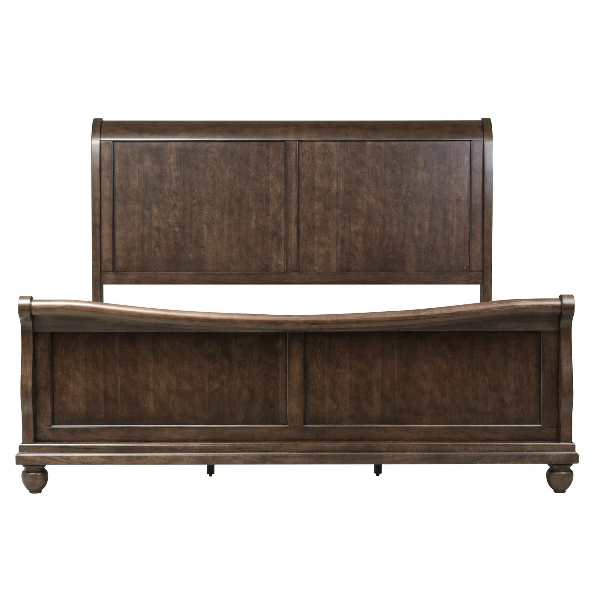 Elevate your bedroom with this beautifully crafted queen sleigh bed featuring classic Louis Philippe styling and a rich rustic cherry finish. The distinctive rolled-back headboard and elegant footboard with rolled cap rail create a timeless silhouette that anchors any bedroom design.