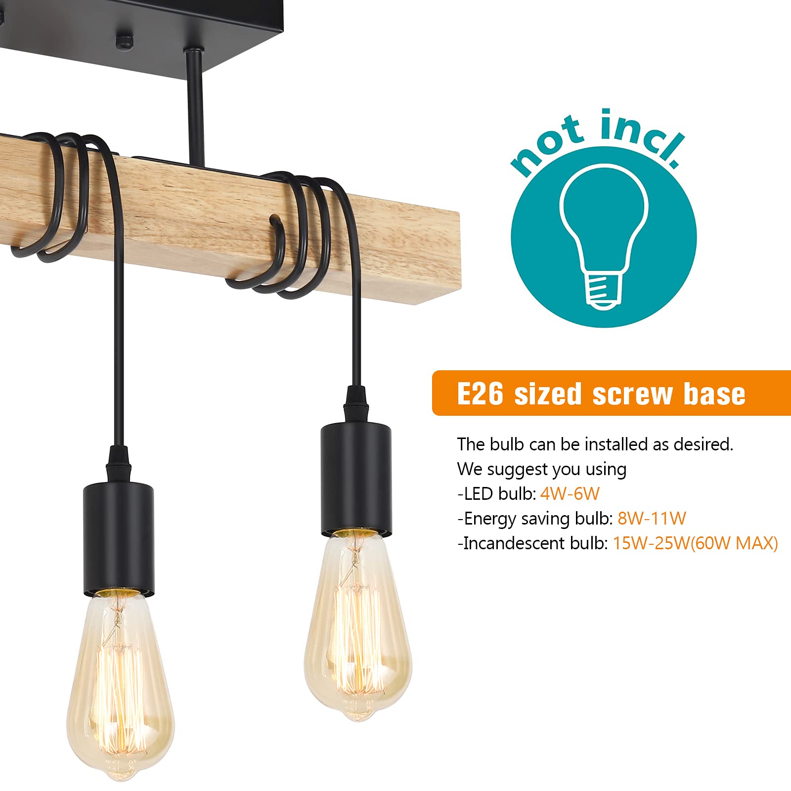 - Bulb Requirements: Max 60W per bulb, the farmhouse hanging ceiling light works well with any E26 bulbs (bulbs not included); bulb types available include LED, CFL, Incandescent, or Halogen, and looks great with antique Edison bulbs.