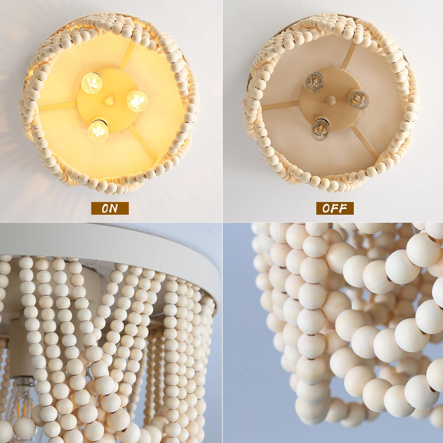 - This boho light fixture comprised of multiple high-quality pure natural wood beads durable with classic bohemia style elements,creating an eye-catching, adding a relaxed and romantic bohemian atmosphere.Three light bulbs cast their warm glow throughout your space.