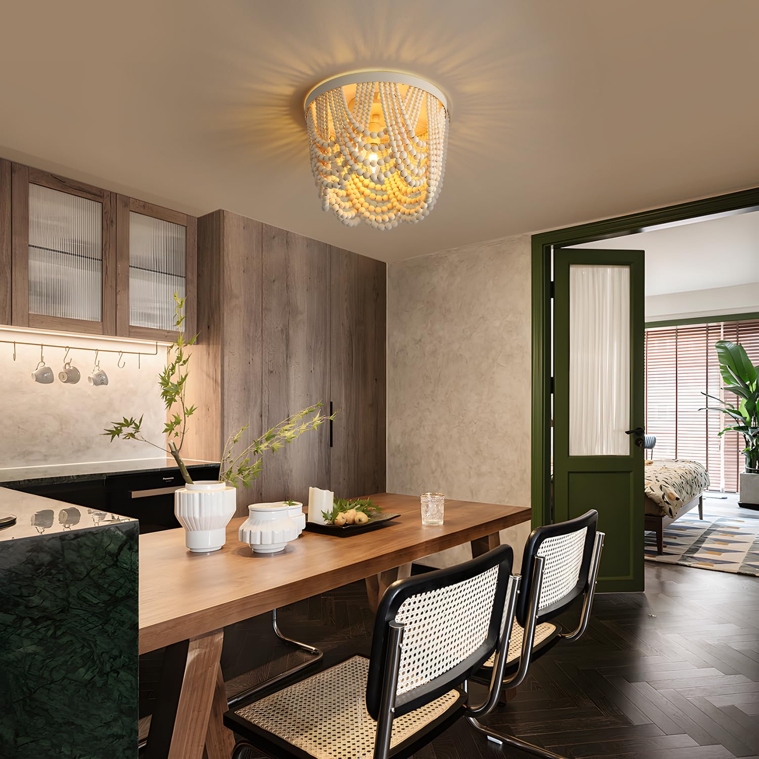 - The boho wood beaded chandelier for bedroom is easy to install, no need to connect beads. It just needs to be fixed on the ceiling. All mounting hardware and instruction are included for quick installation. You will save your time and be happy to enjoy your new decoration.