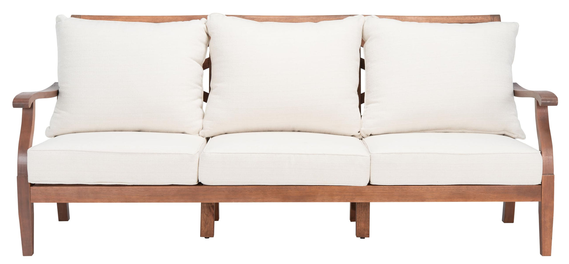 - [COUTURE CHIC DESIGNER DETAILS]: Add a couture chic touch of style to your home with this comfortable and inviting 3-seat sofa; Features plush beige upholstery, chic natural brown finish, and beautiful cross back details; Pair with a coffee table and accent chair from SAFAVIEH's Payden Collection