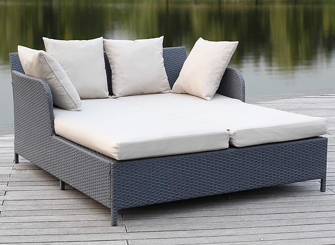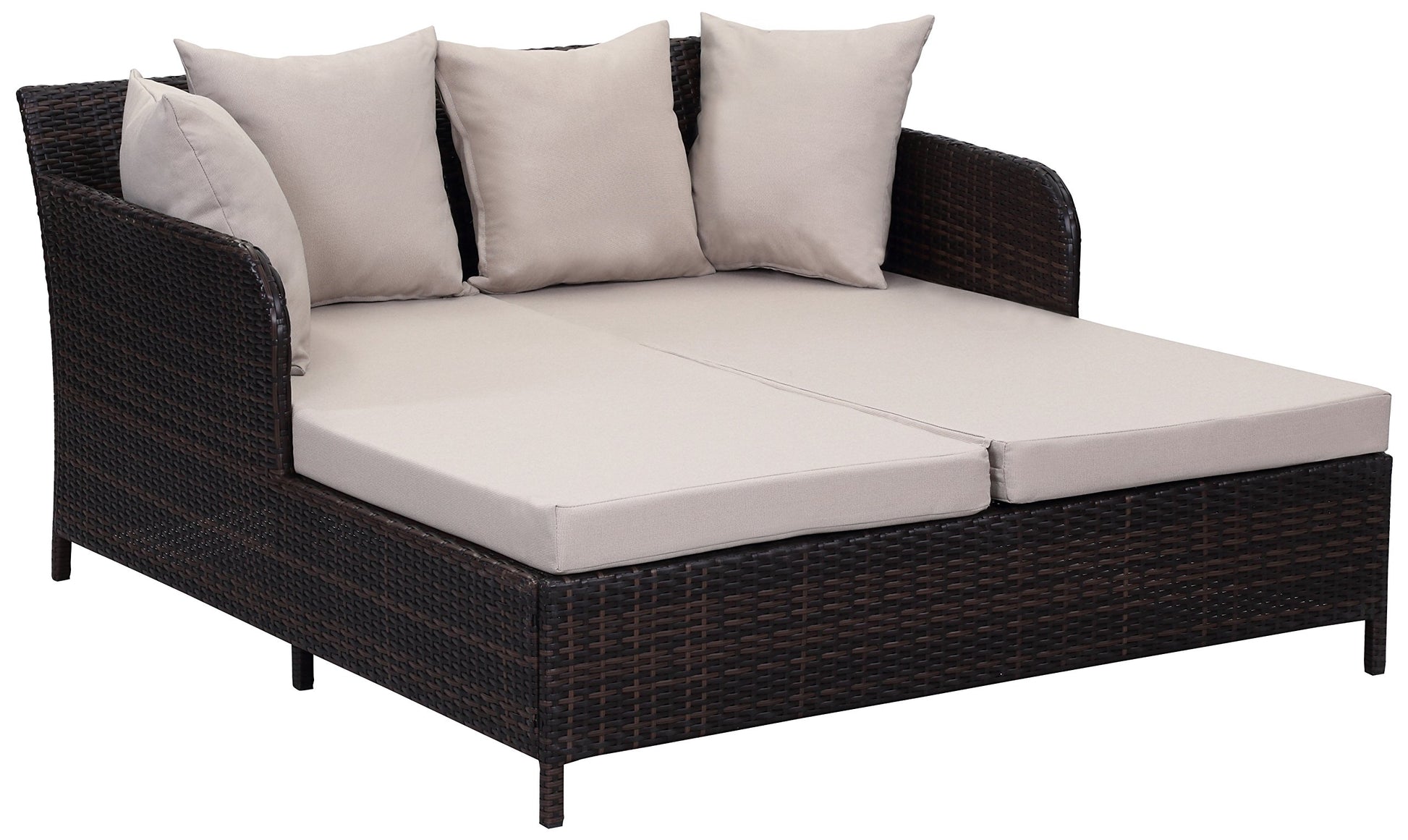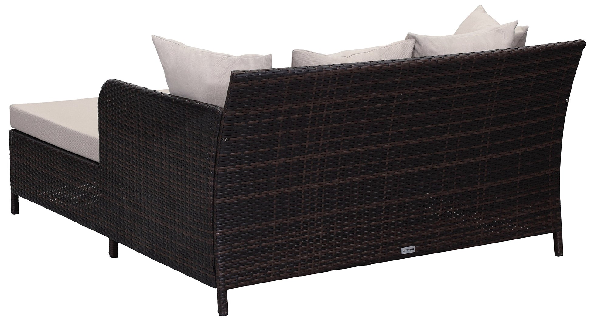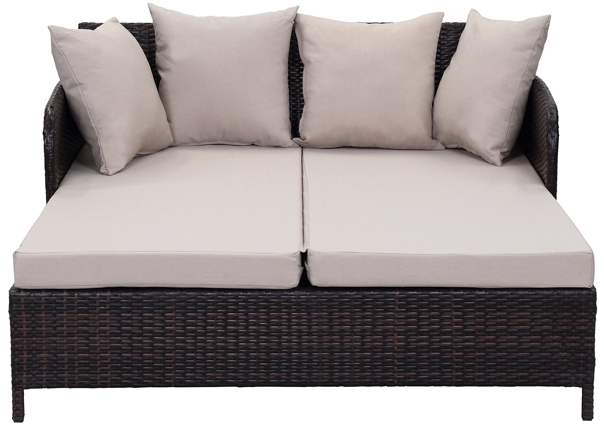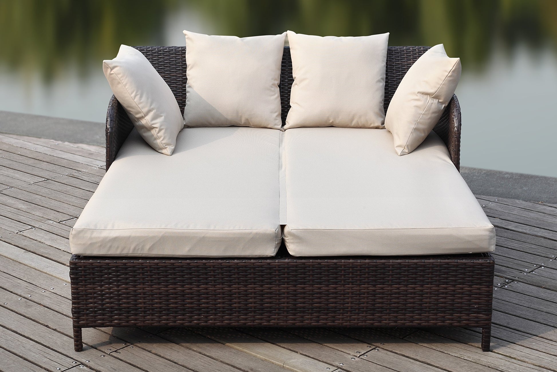 - The sand upholstery and brown finish of this daybed will add the perfect accent to any outdoor space