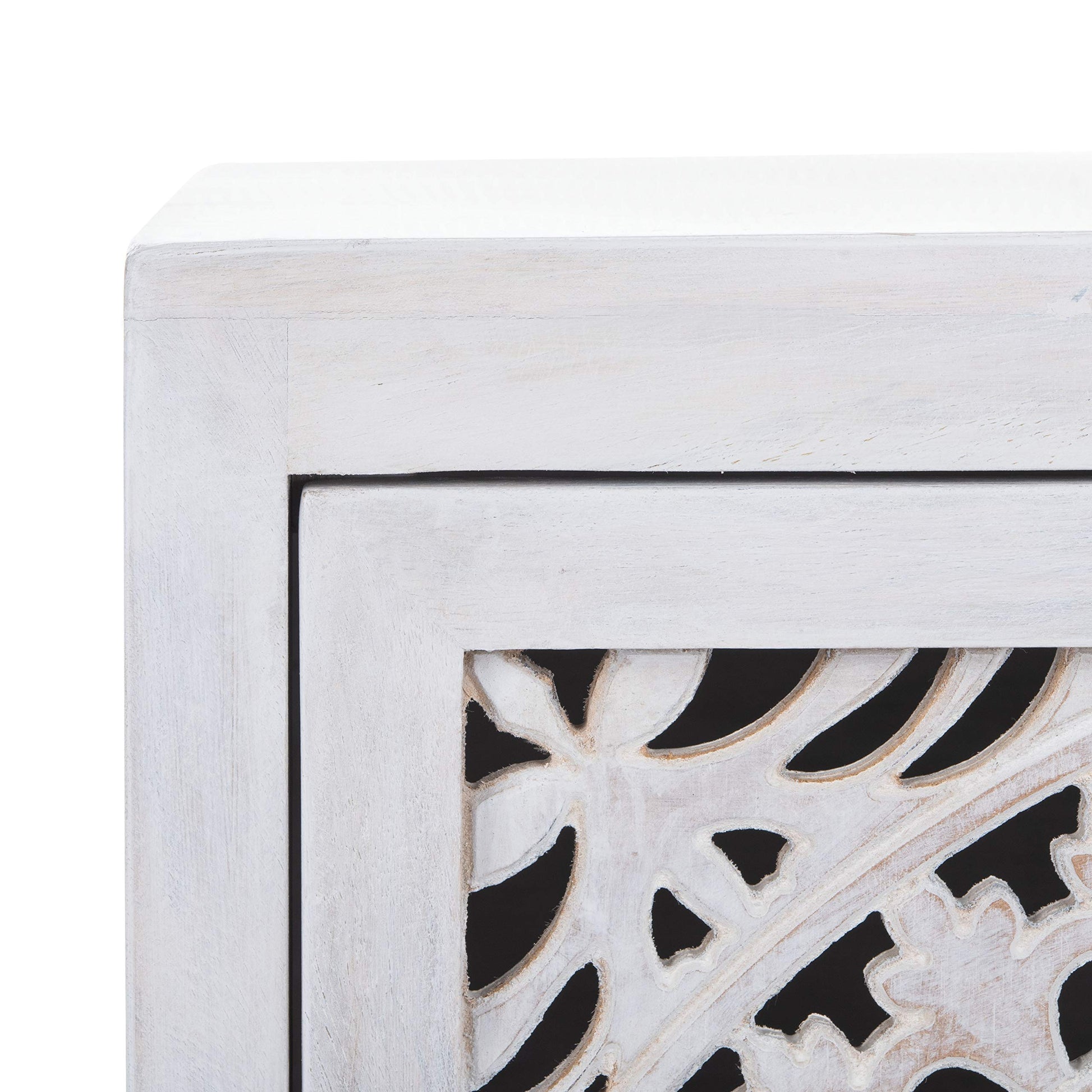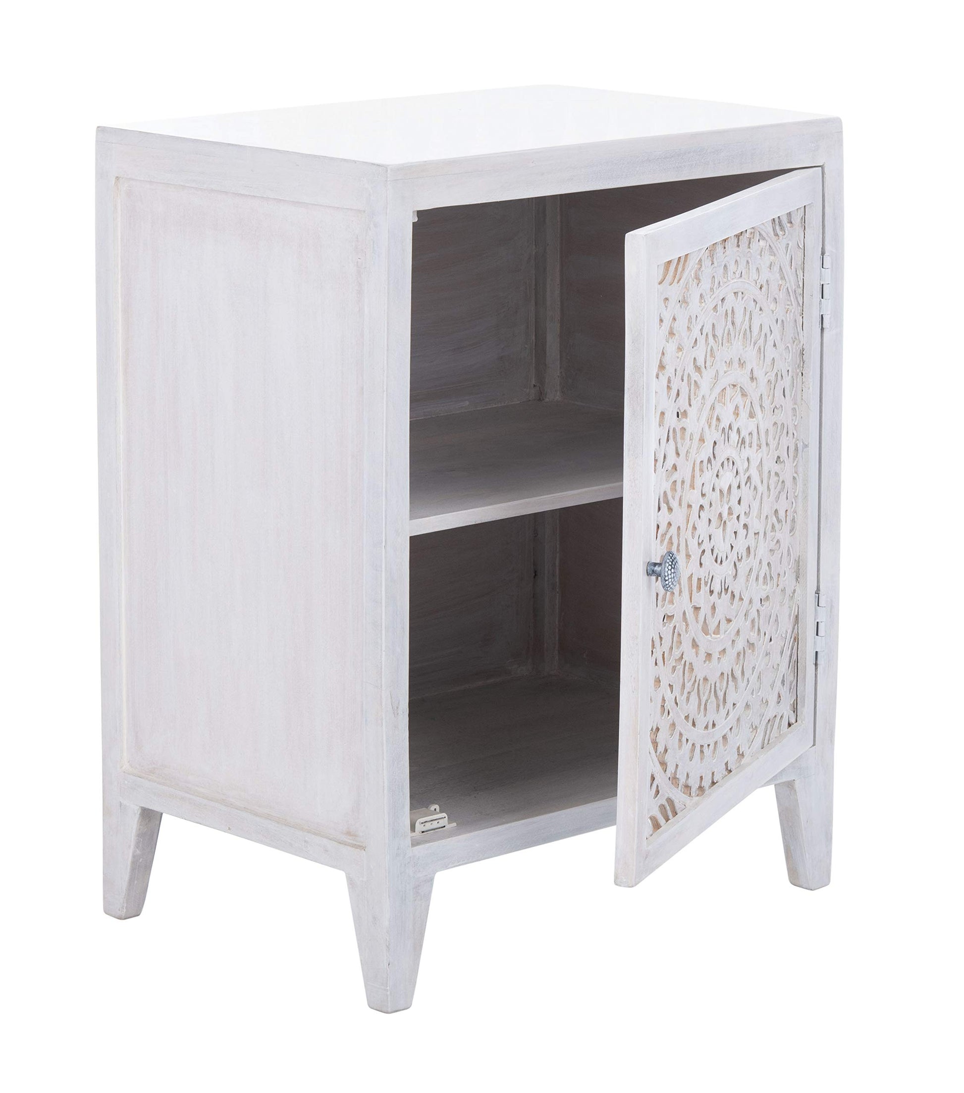 - Features one (1) door with a beautifully carved mandala design and two (2) shelves