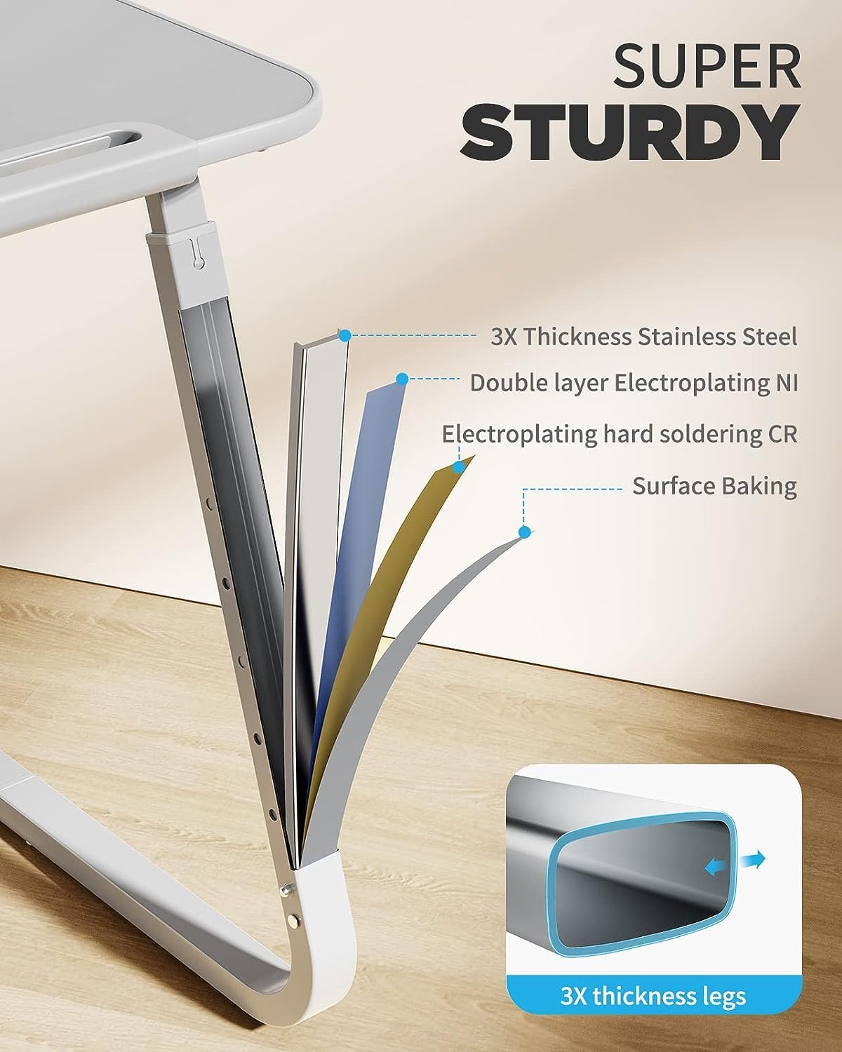 - Upgraded TV Trays: This sturdy and stableTV table panel is wrapped with PVC leather which is anti-slip, waterproof, scratch-resistant, and easy to clean. Tables tray built-in a tablet slot, a cup holder. SAIJI new standing food TV trays is designed to be sturdier and more durable than other TV trays on the market. With a 5x thickness surface and 3x thickness legs. can held up weight to 120lbs, not only easily to adjust the desk height & tilt, but also stylish to get your favor.