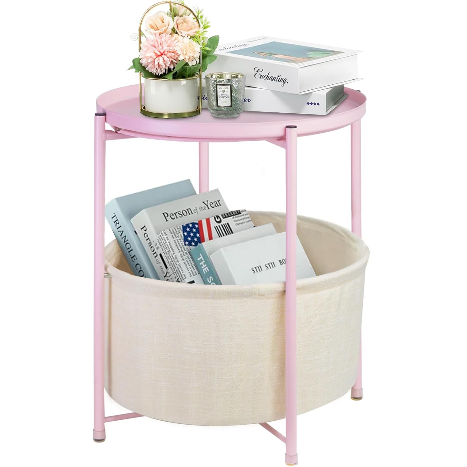 End Tables with Storage Basket, Metal Side Table Nightstand Small Bedside Table, Pink