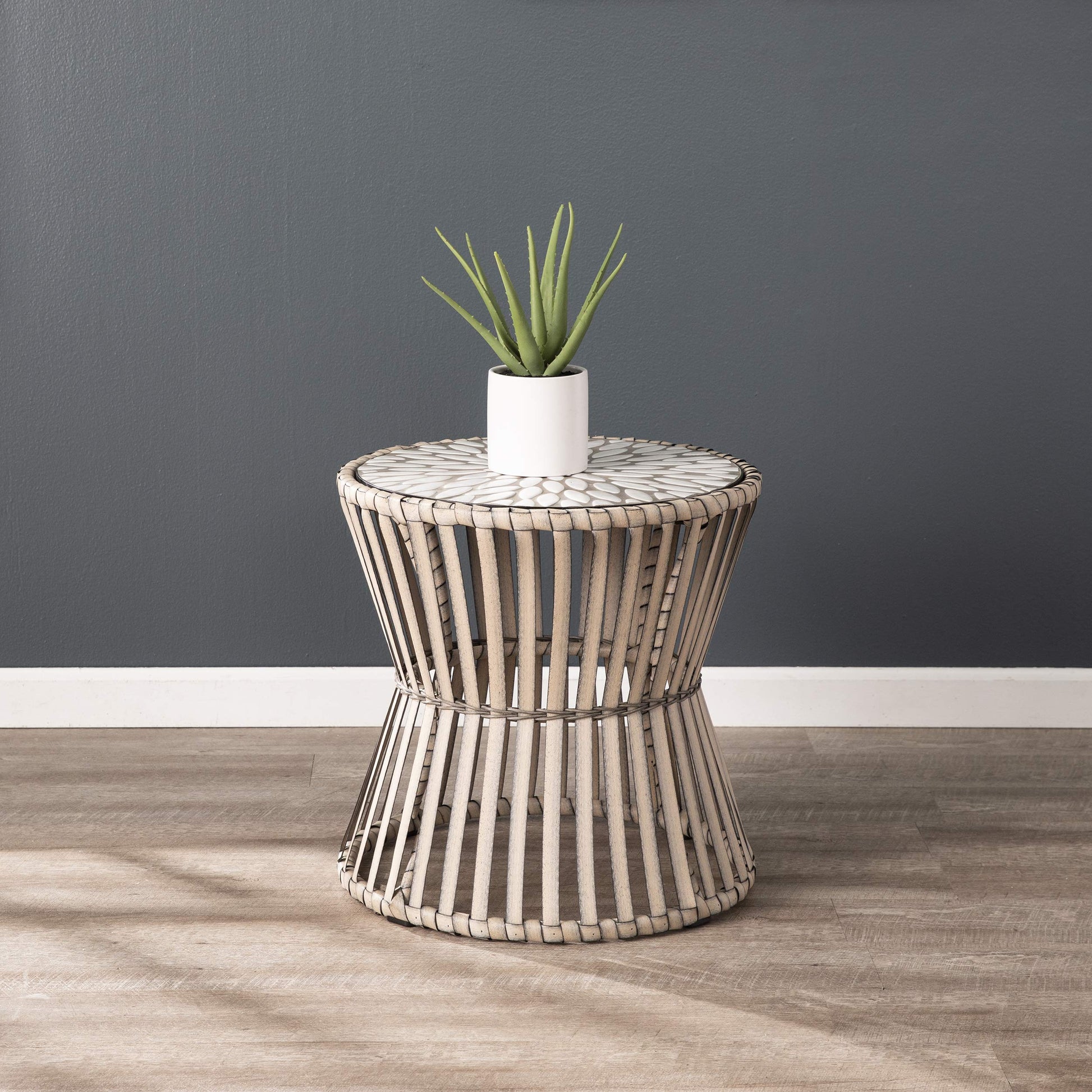- Weather-resistant iron base and decorative faux wicker strapping; Unique floral design on tabletop crafts a traditional feel in modern mixed materials