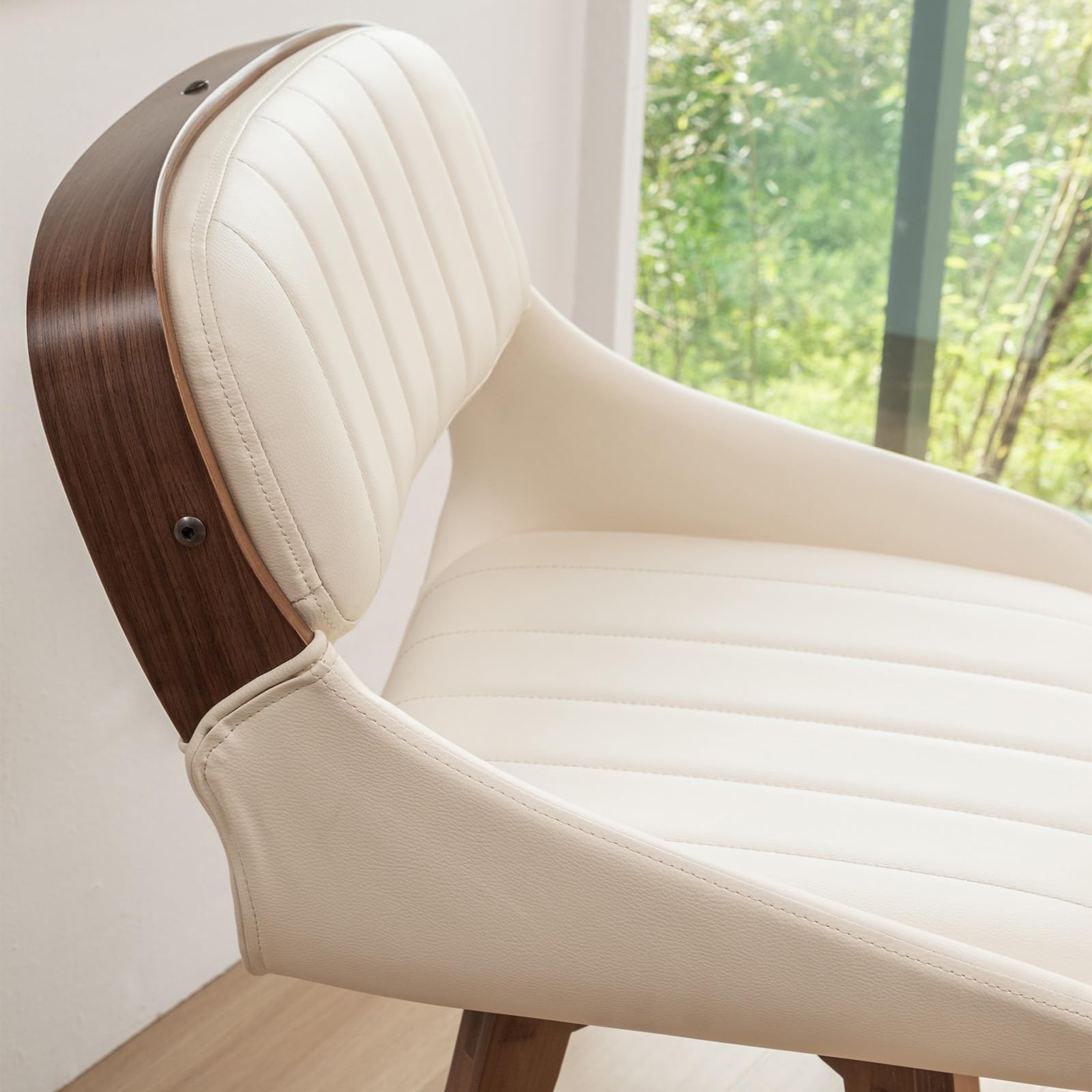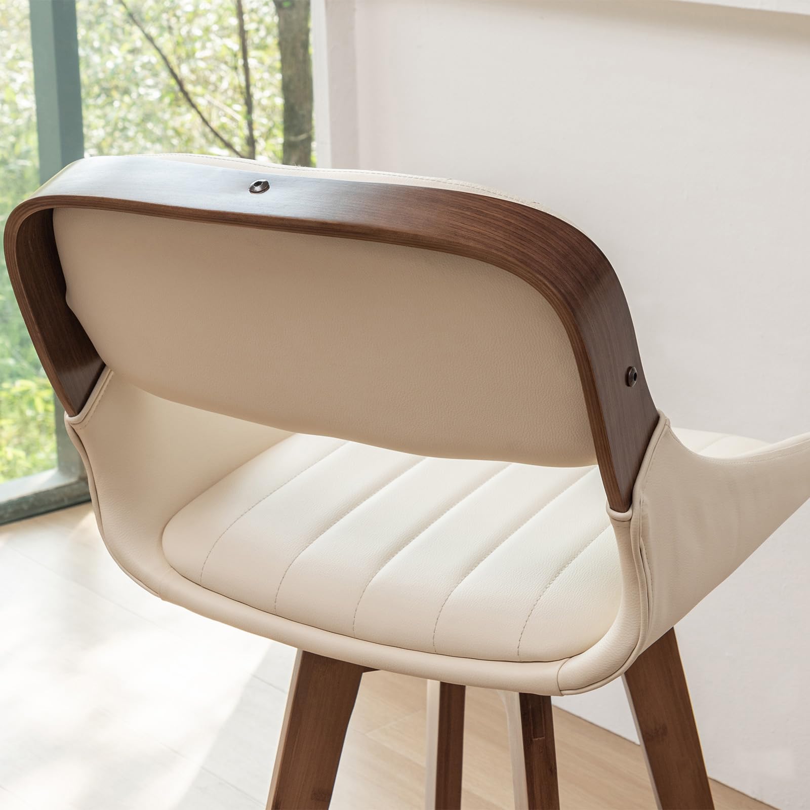 - Constructed from durable bentwood with a walnut finish, these counter stools swivel with arms blend style with robustness, supporting up to 330 pounds. Their enhanced build guarantees superior quality and lasting durability. The seats and backrests, upholstered in premium faux leather of the swivel bar stools with arms, are waterproof and easy to clean, ensuring enduring resilience. With their elegant design and functional attributes, these faux leather counter stools provide a perfect mix of sophistication and practicality.