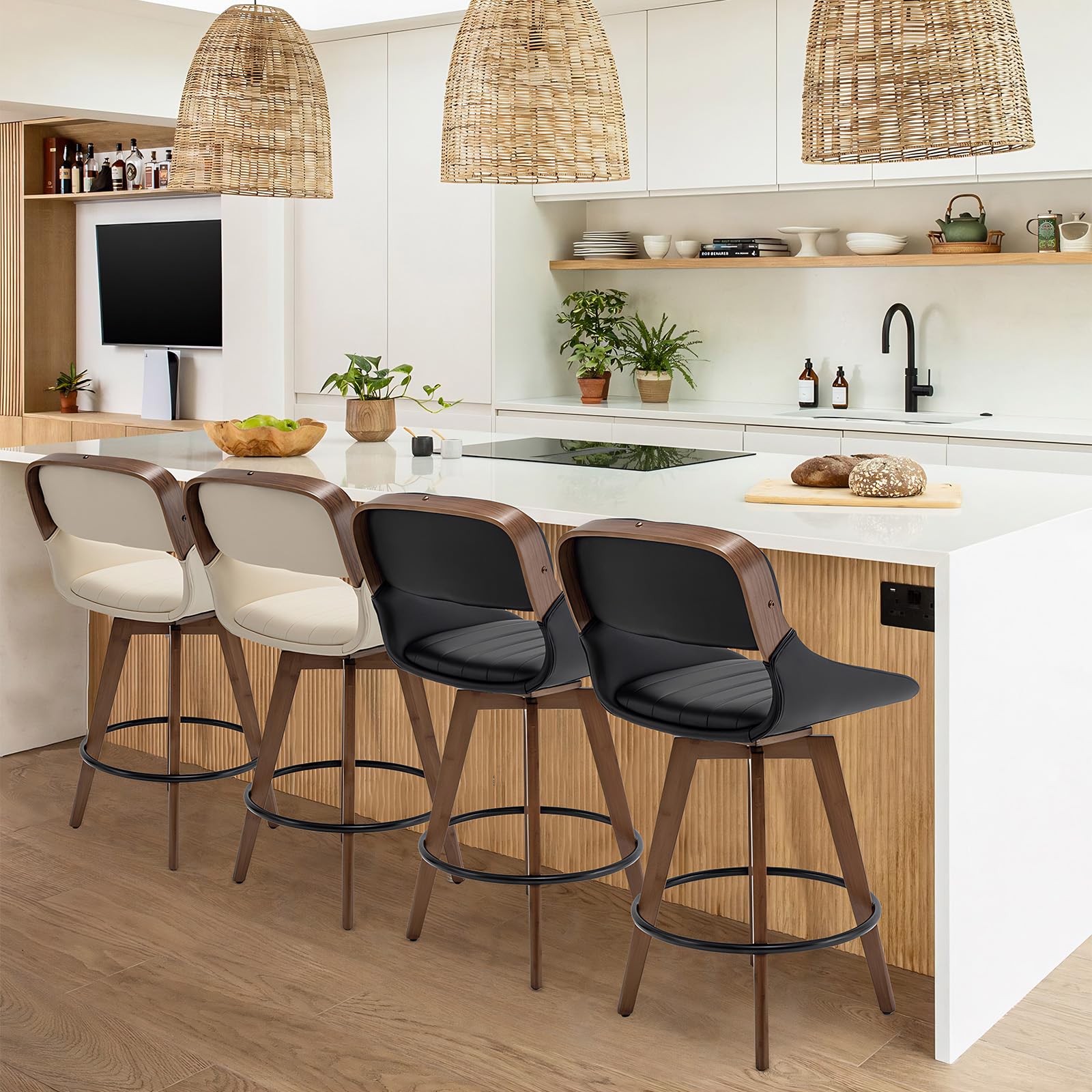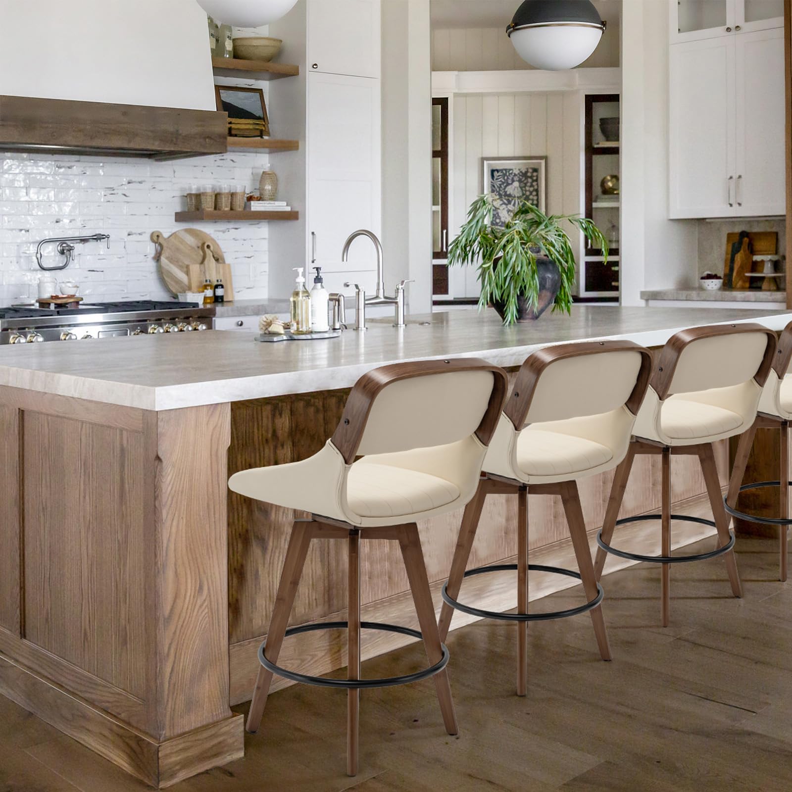 - These bar stools with backs and arms boast a versatile and stylish design, seamlessly integrating into various environments such as home kitchens, cafes, dining spaces, business venues, restaurants, and lounges. Each counter stool for the kitchen island features a durable metal footrest ring, enhancing comfort for prolonged sitting and reducing fatigue. Their adaptability and considered design make the mid-century modern bar stools a perfect selection for multiple settings, infusing a modern touch wherever they are positioned.