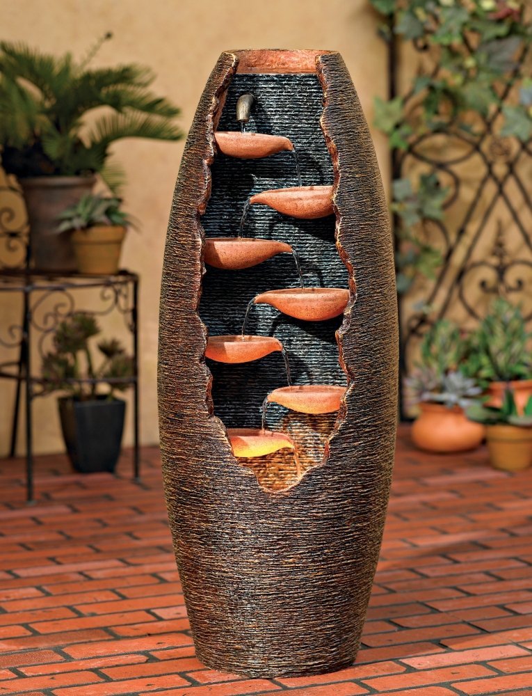 - Add a freestanding tiered outdoor floor fountain with a light to a front yard corner. This lighted cascading fountain combines a graceful water fall design with garden decor, making it the perfect outdoor decor centerpiece for relaxation.