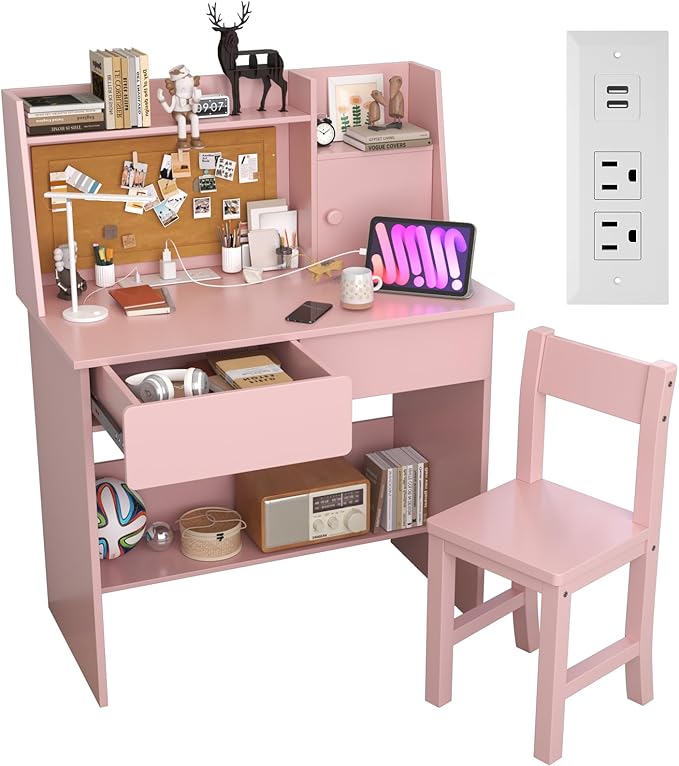 - This kid's desk and chair set comes with a clipboard, a cabinet, and two drawers, The desk offers you ample space to keep books, documents, and other things. Above Desktop with 2USB Ports and 2Outlets Connects to laptops and desk lamps, suitable for adults and children.-fKCfgj