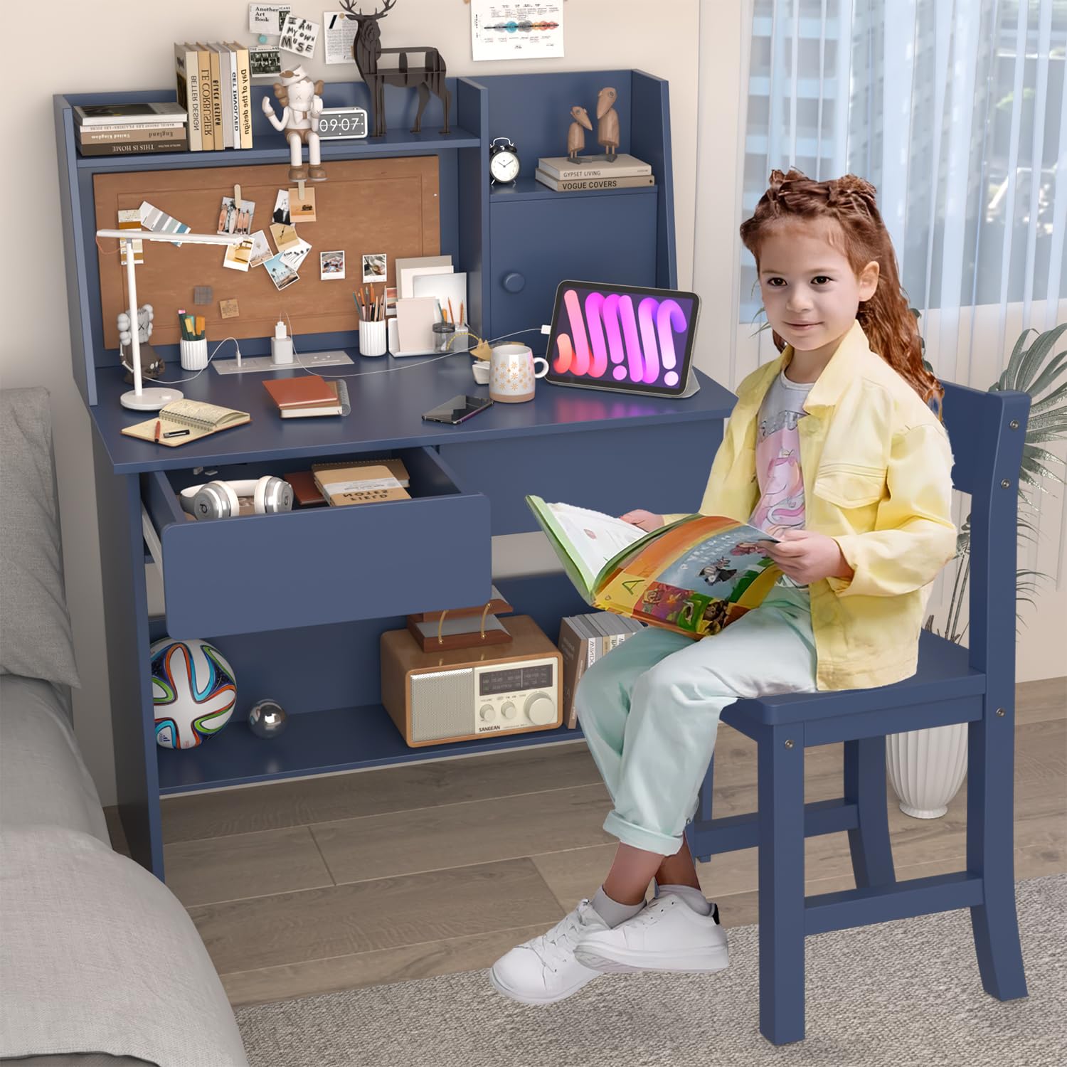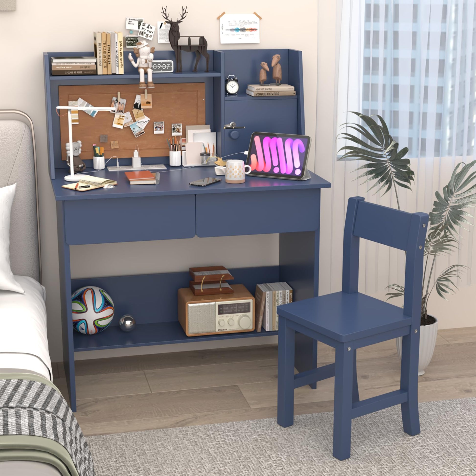 Blue Kids Desk and Chair Set for 5-12 Year Old, Childrens Computer Desk with Drawers and Storage Shelf
