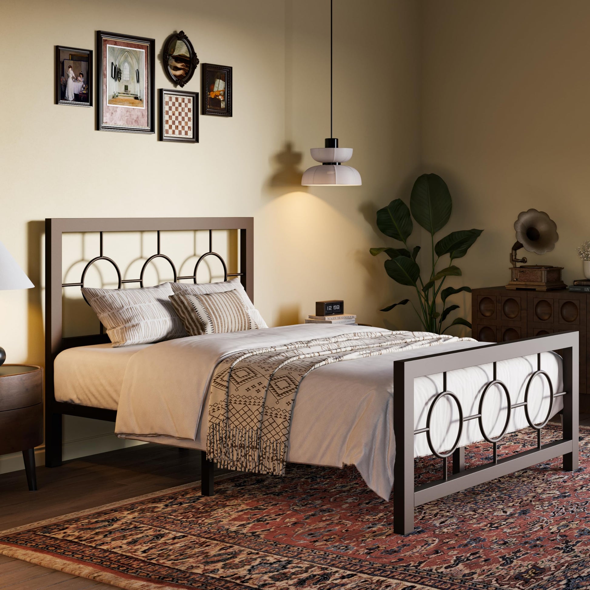 Twin Metal Bed Frame with Vintage Circular Design Headboard and Footboard, No Box