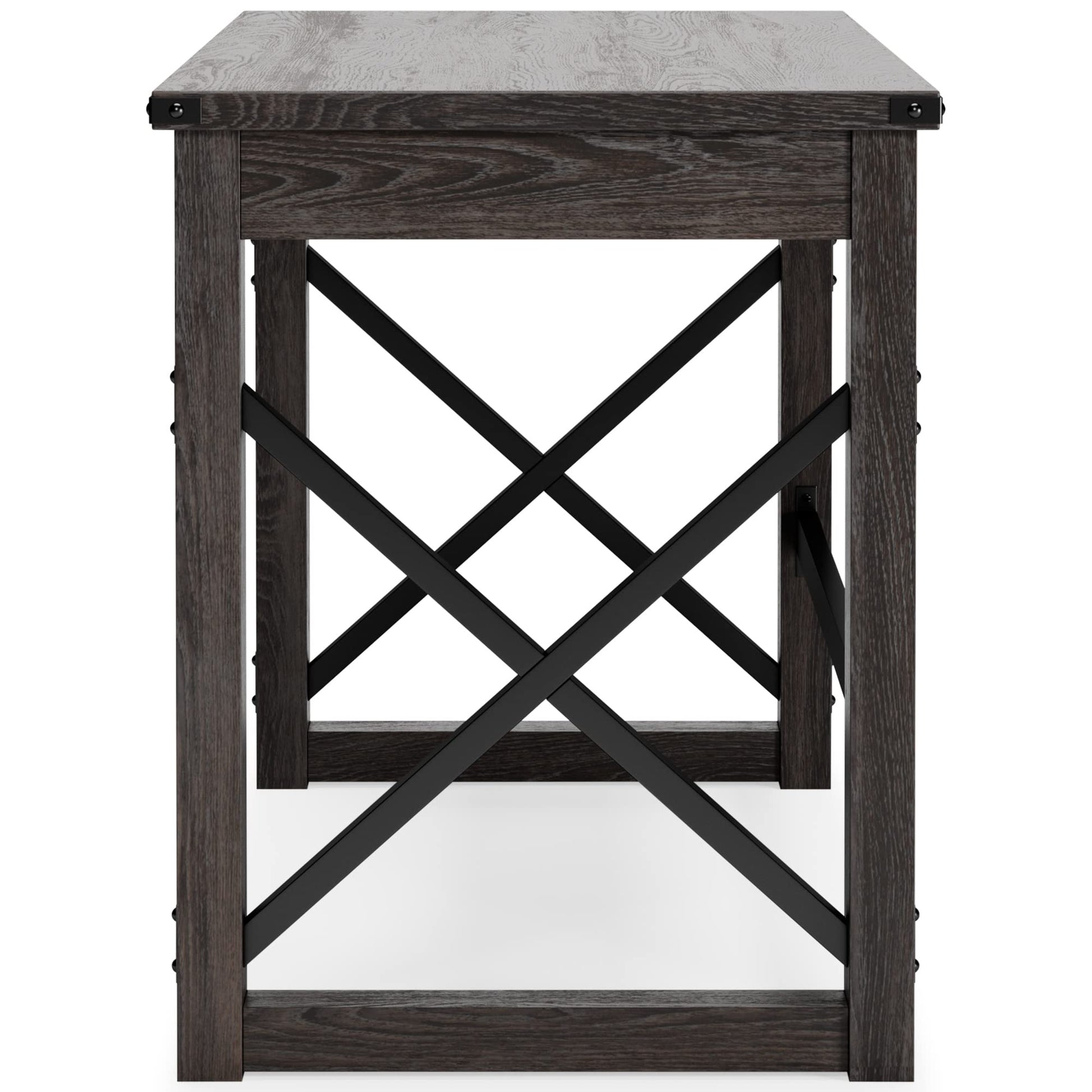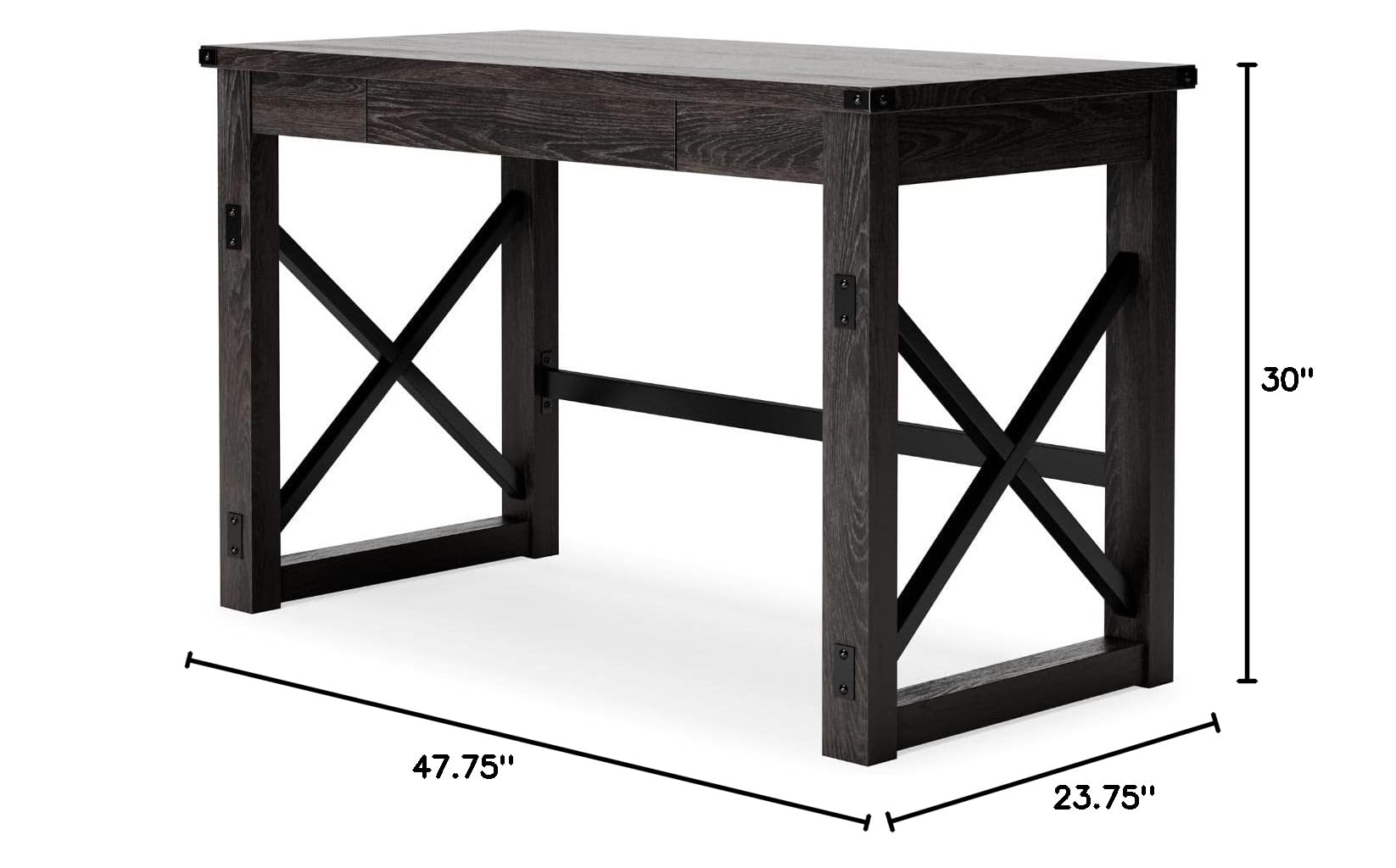 - WOOD WITH METAL ACCENTS: For rustic farmhouse appeal, the desk has whitewashed decorative wood grain laminate and metal accents plus cross-buck rails and a stretcher in contrasting black iron tone