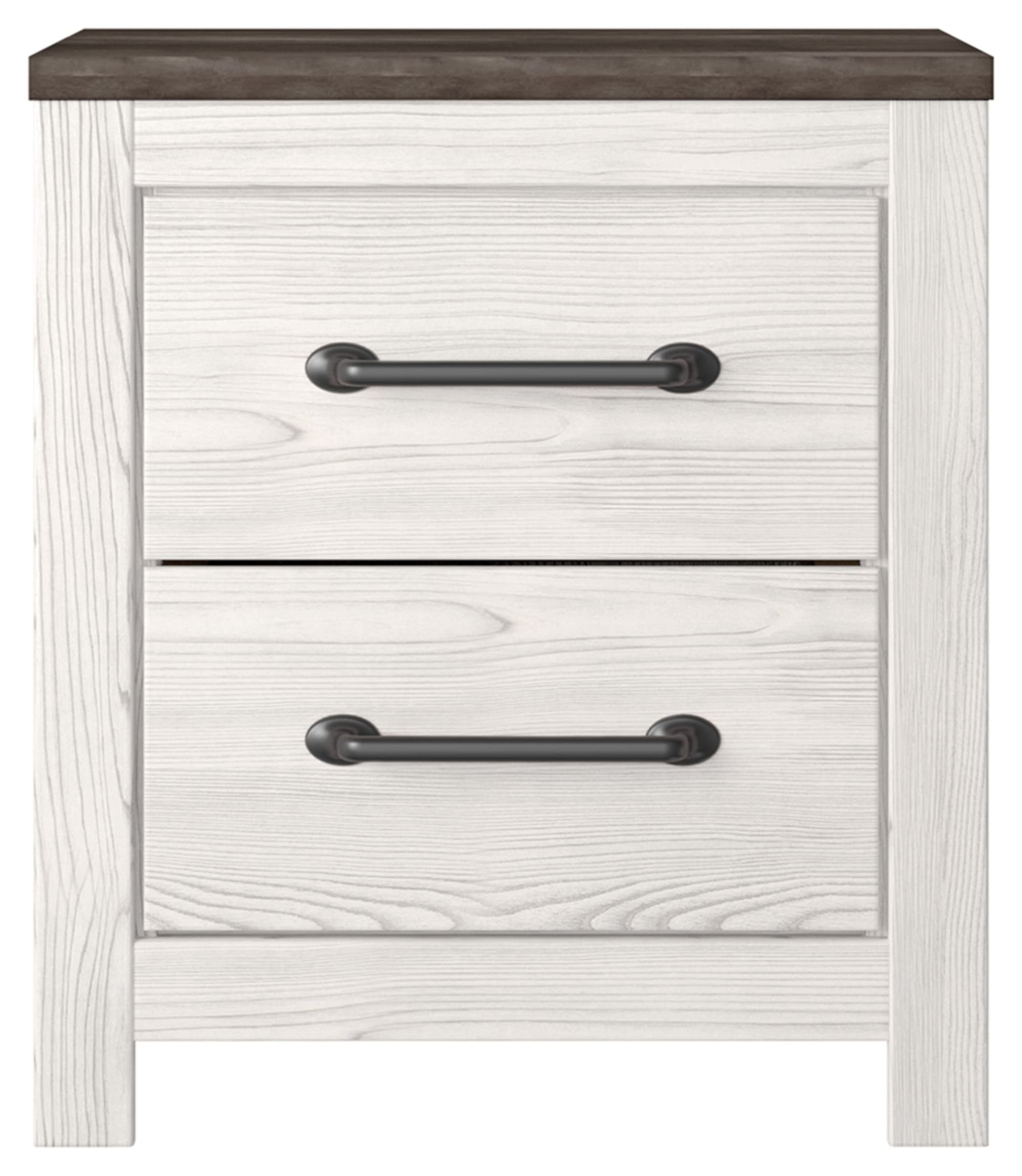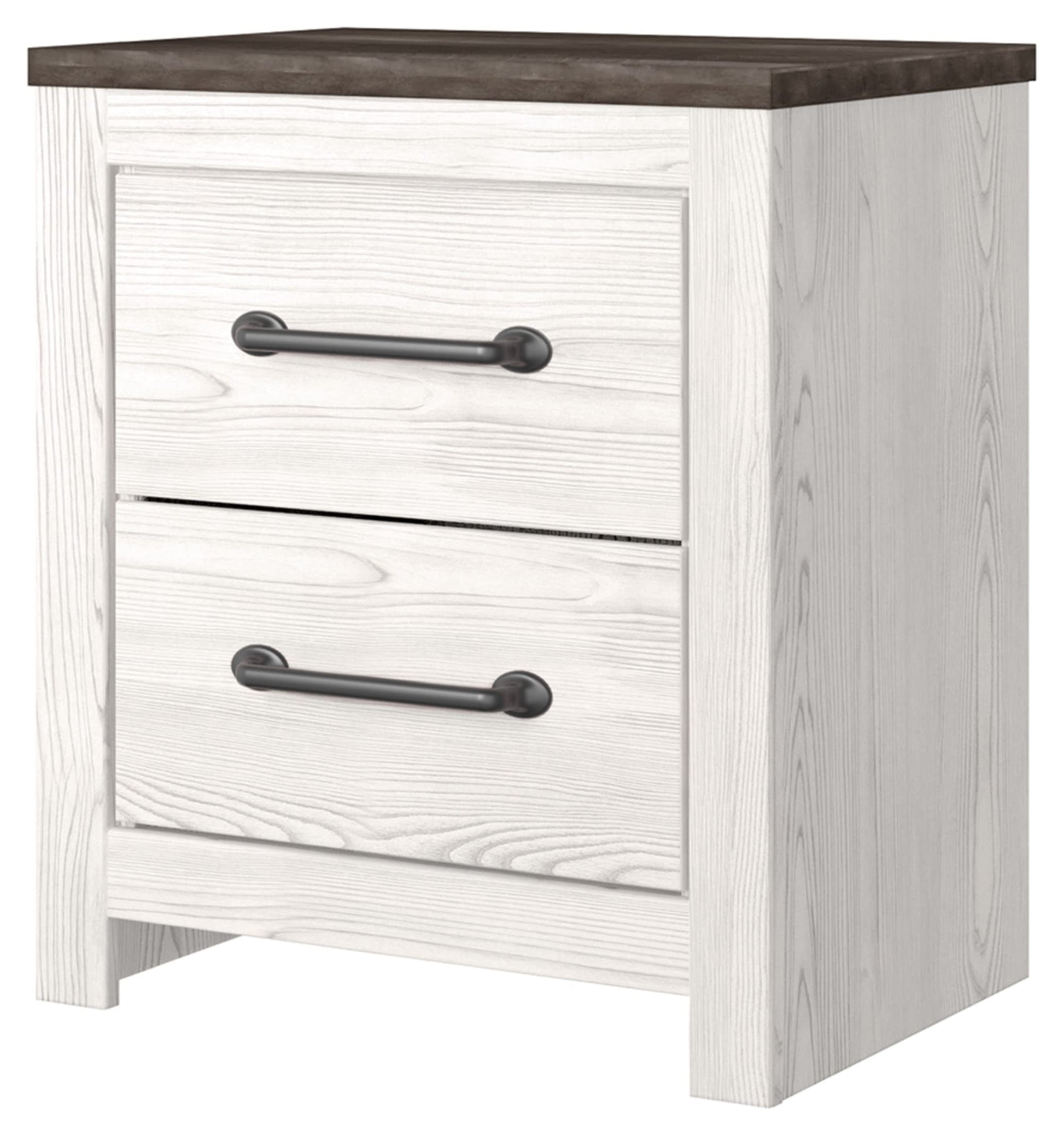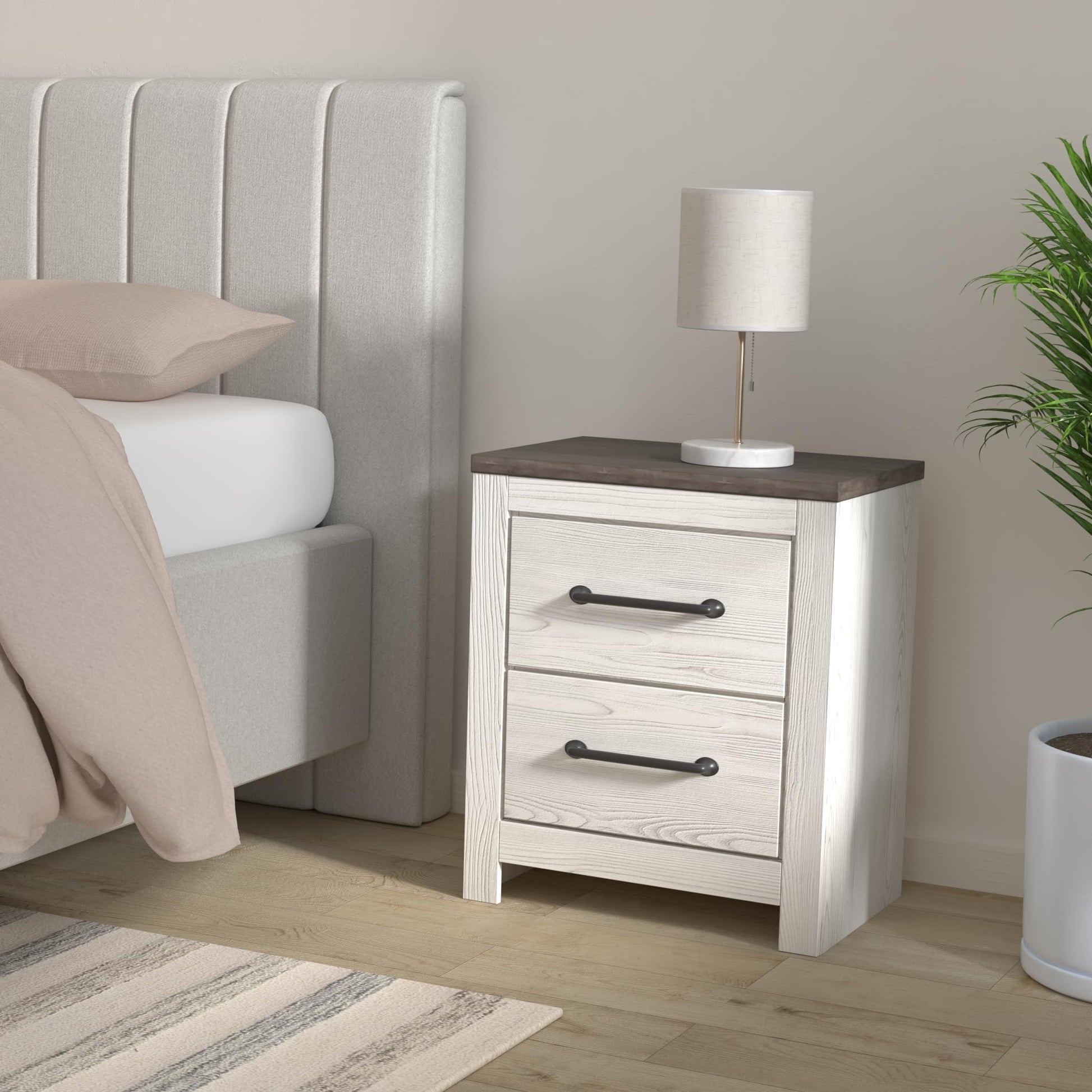 - TWO-DRAWER NIGHTSTAND: Cool, clean and casually modern. This nightstand's wispy whitewash and gray finish sets the tone for your bedroom's calming sanctuary