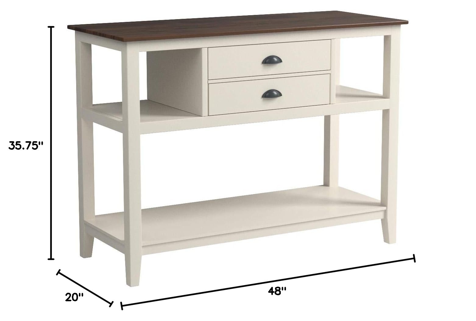 - HANDSOME CRAFTSMANSHIP: Made of veneers, wood and engineered wood with a two-tone finish. Drawers, legs, and shelves are finished in a cozy cottage white and the table top is finished in a warm, burnished brown