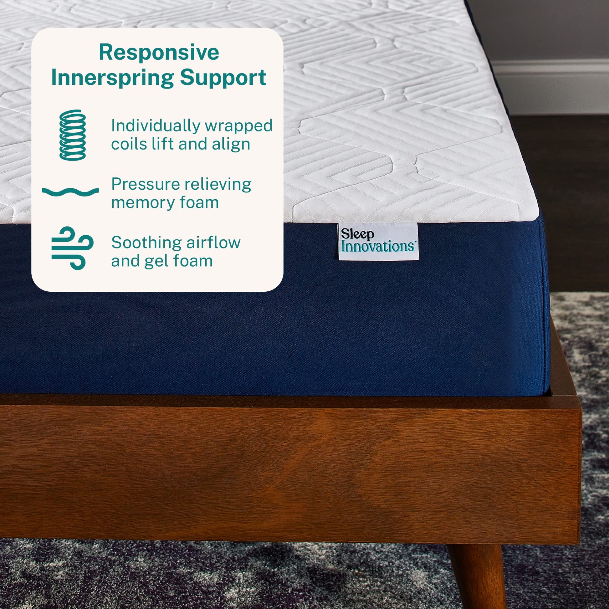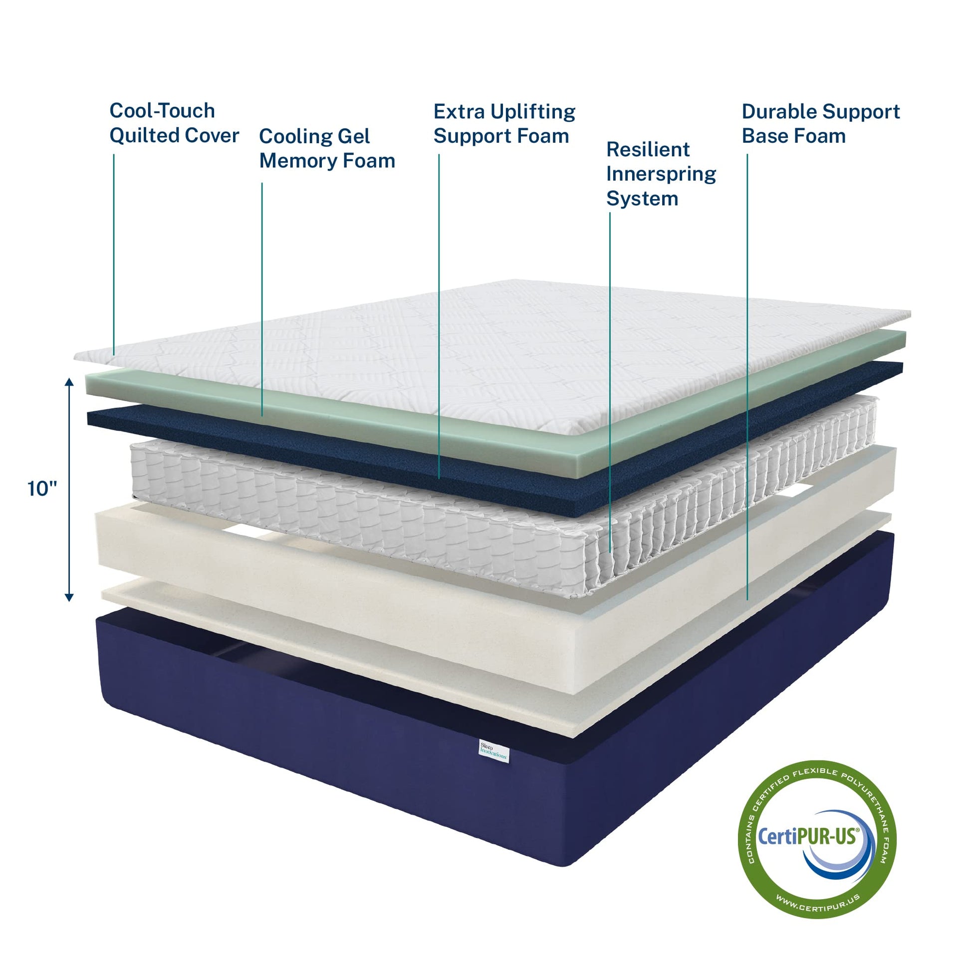 - Queen Size Memory Foam and Innerspring Hybrid Mattress: This 10 inch hybrid mattress combines a quilted cool cover, gel memory foam, uplifting body and edge support, plus durable base foam to provide a medium firm feel