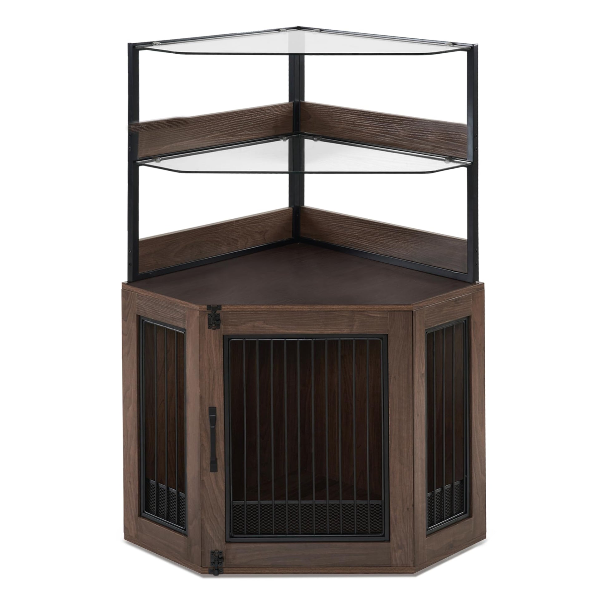 Transform your pet's space with this elegant corner dog crate furniture that seamlessly blends functionality with sophisticated home décor. Crafted from premium wood with a rich brown finish, this dual-purpose piece serves as both a comfortable pet kennel and a stylish accent table with glass shelving.