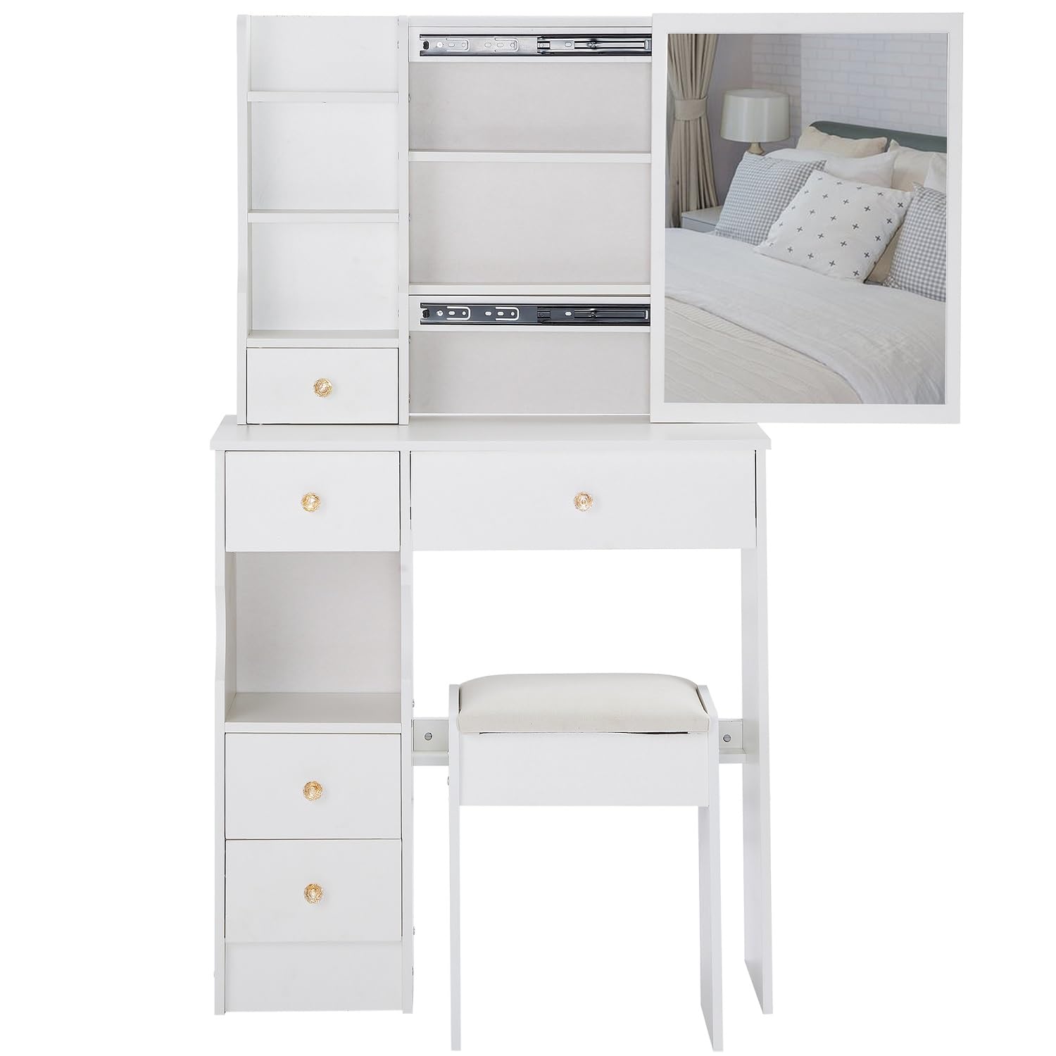 - [Practical and Unique artistic beauty]: This vanity table was designed by young designers from the New York School of Interior Design, who possess unique talents, advanced concepts, and professional design abilities. This makes our dressing table both practical and uniquely artistic beauty.
