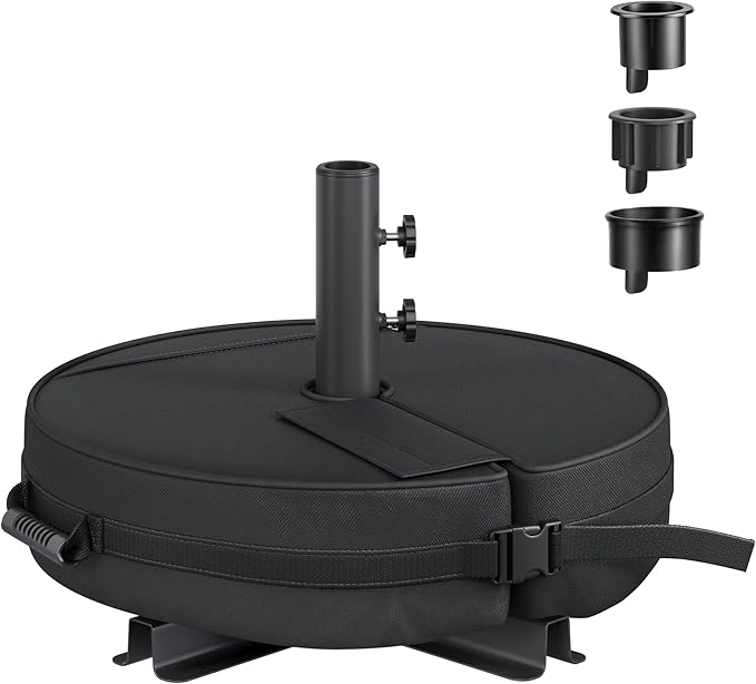 - With its solid construction, which comprises a cross base, pole holder, outer frame, and a bag that can be filled up to 88 lb of sand, this umbrella base ensures stable support for your umbrella. Enjoy the great outdoors with peace of mind