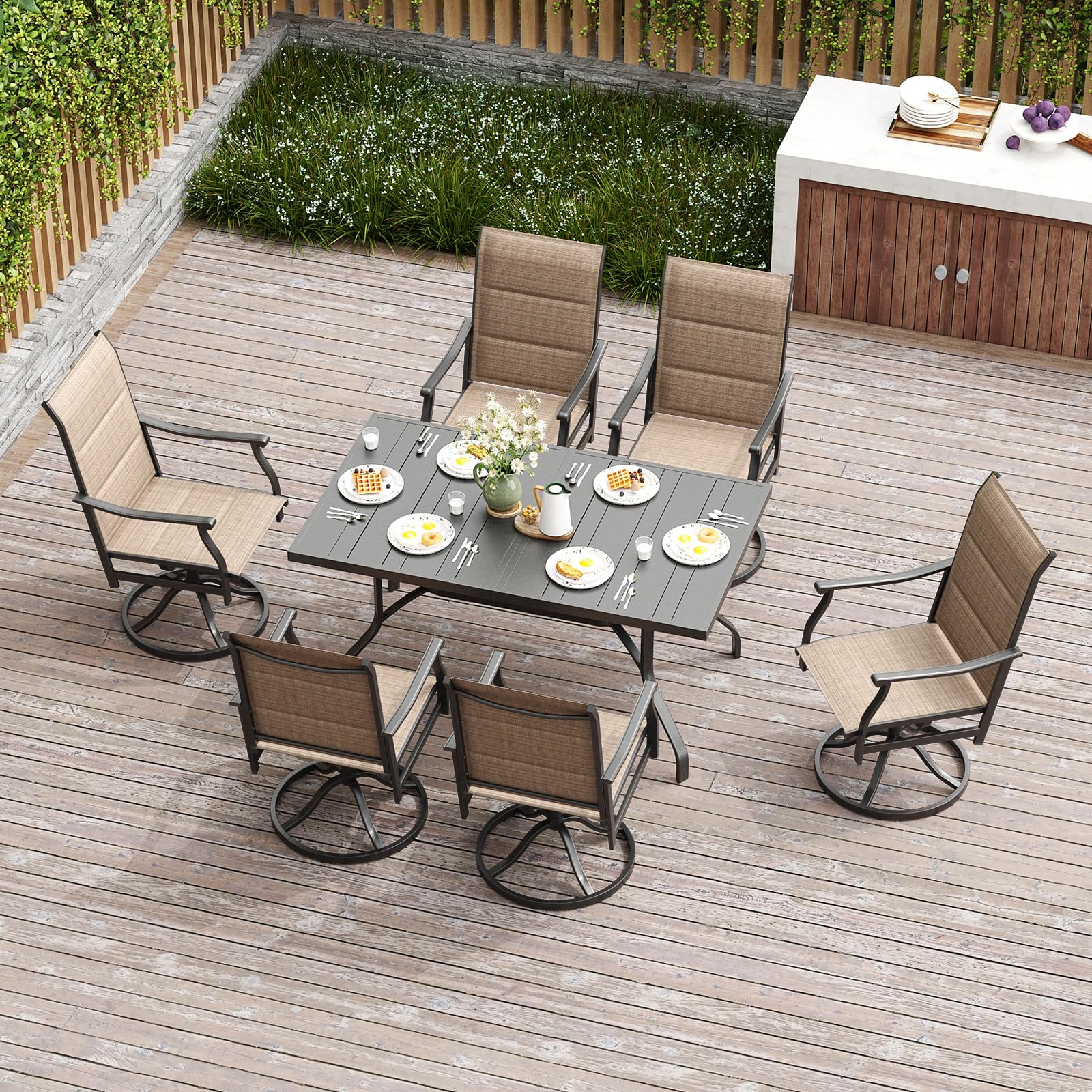 - [INSTRUCTIONS]: Ourdoor dining set includes Patio Table x 1 PC, Swivel Dining Chairs x 6 PCS. Patio table size L 60"x W 35"x H 29", N.W 55 LBS, patio chair size L 23"x W 27.5"x H 40", N.W 24.2 LBS. Ideal 7-piece outdoor furniture set for hosting family meals or entertaining guests in your outdoor space.