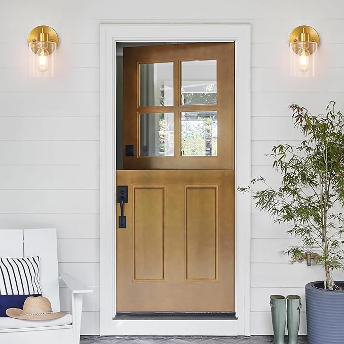 - [Modern Design] Advanced brushed gold texture coupled (high quality metal, anti-rust and won't fade) with transparent glass retro shade, showing a refined and modern style. It is suitable for wet places such as bathroom lights over mirror, laundry rooms, dining room, living room, corridor, cafe, basement, bar, club, office, library, and bedroom.