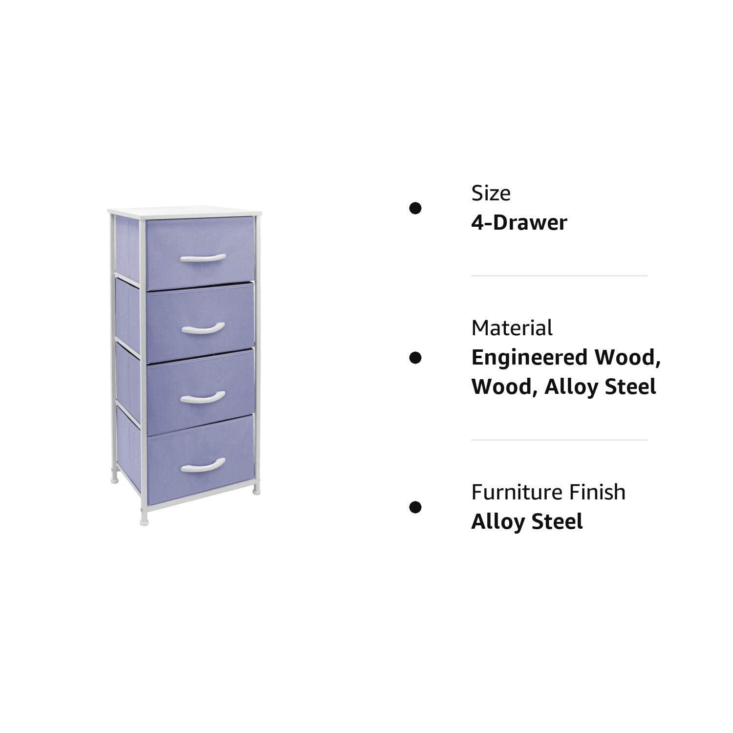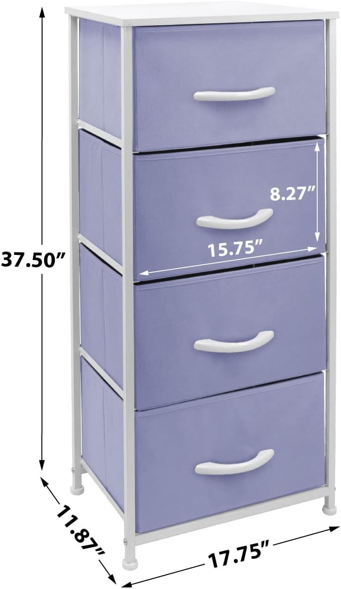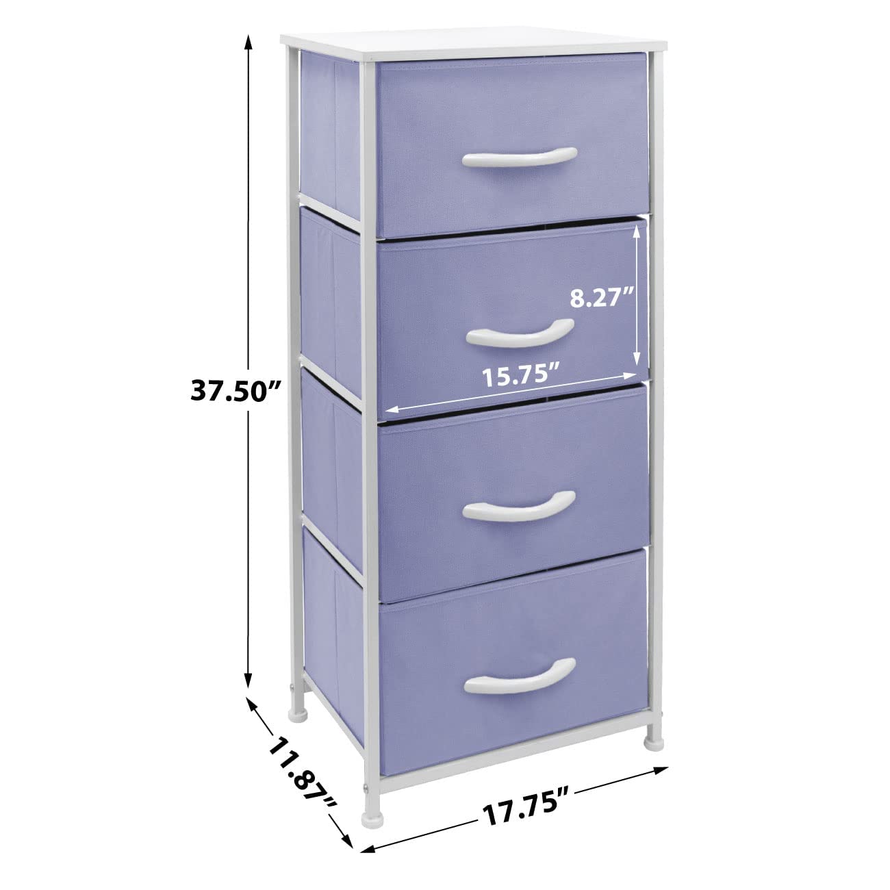 - KID-FRIENDLY DESIGN — Sleek vertical storage — Made with strong steel frame and durable MDF wood top with smooth white finish — Made of non-woven fabric — Wipe clean — Minimal assembly required — Hardware and instructions INCLUDED — Measures approximately 17.75” L x 11.87” W x 37.50” H - Drawers measure approximately 15 x 11 x 8 in