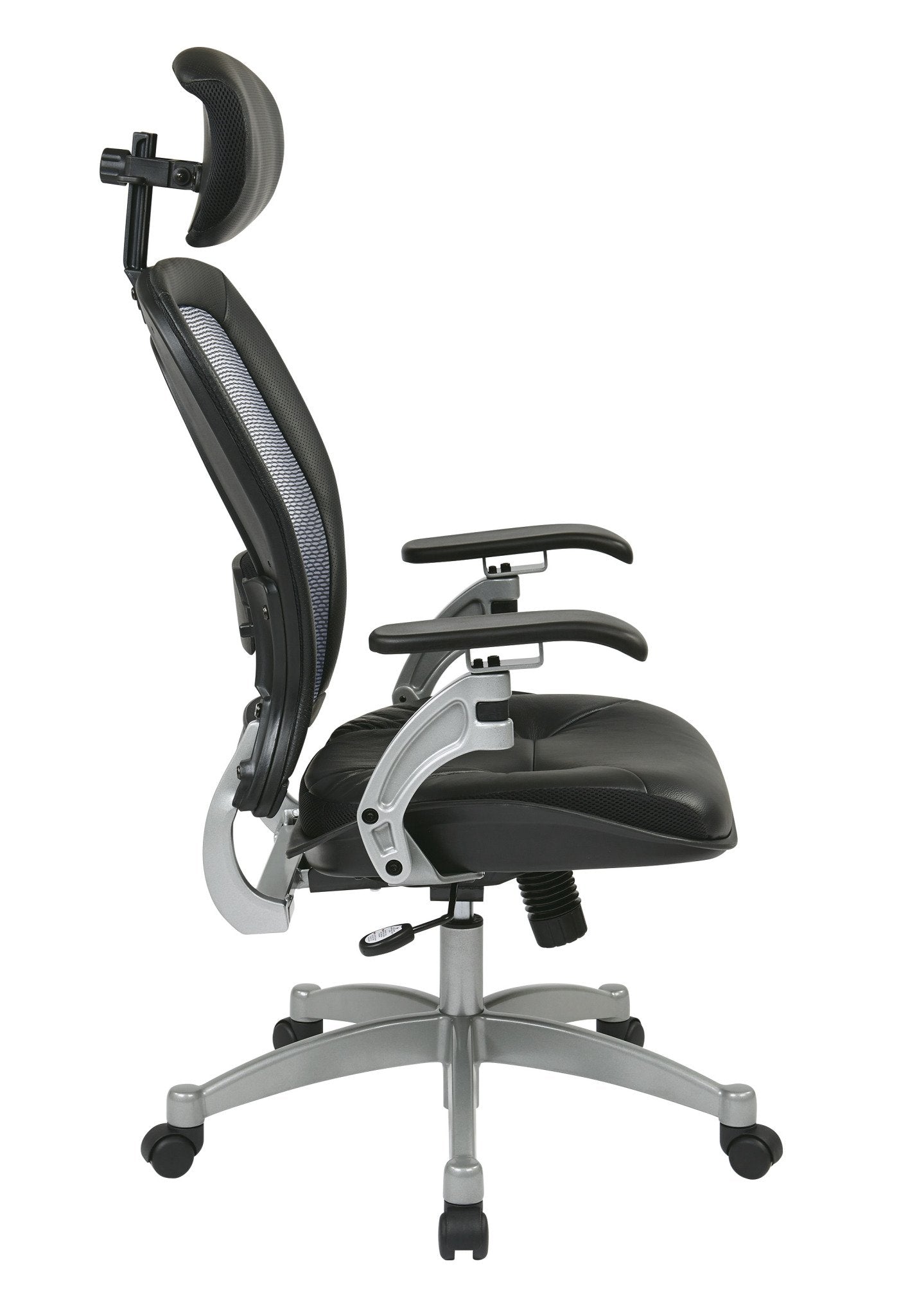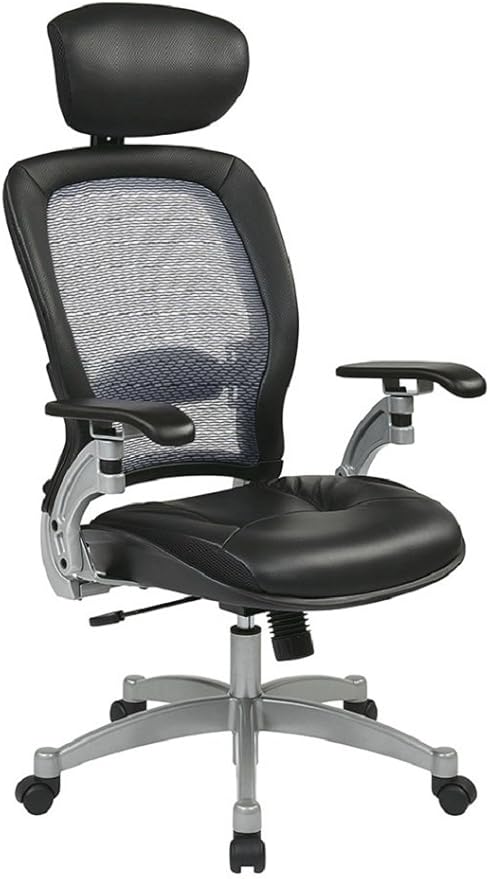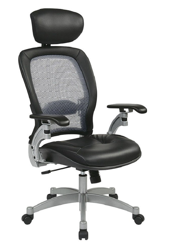 - Thick padded black top grain leather seat with breathable Air Grid mesh back offers strong support and comfort for seated tasks