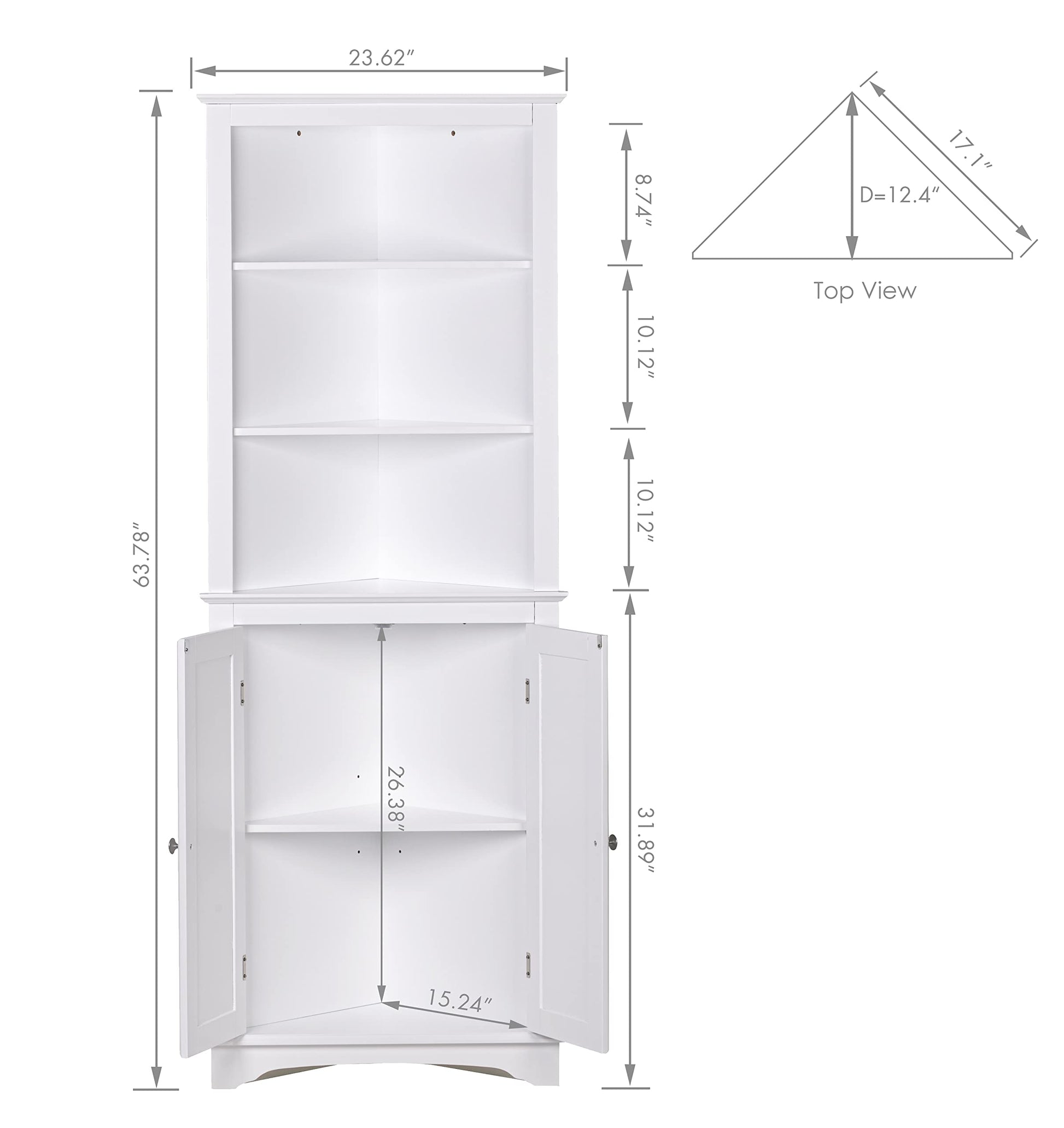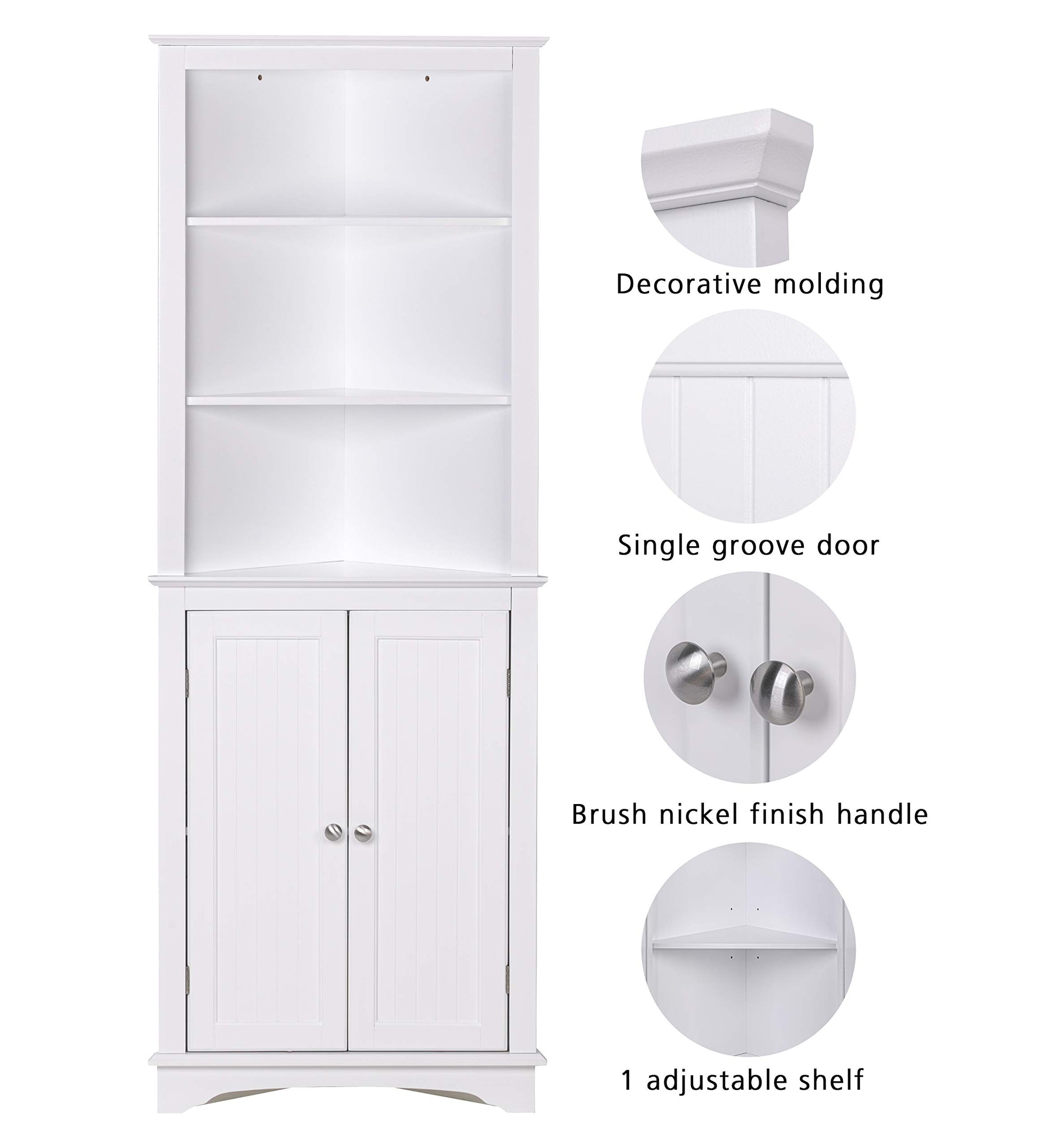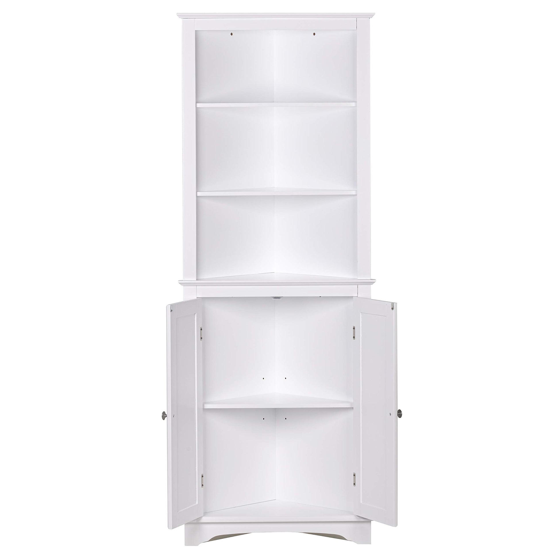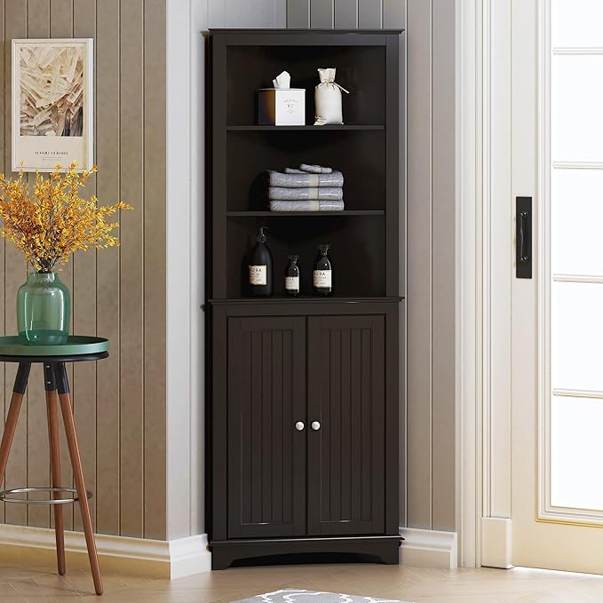 - MAXIMIZE STORAGE: This bathroom corner cabinet is equipped with three fixed open shelves for quick access or display, and a cabinet with double doors for more concealed storing. The interior adjustable shelf allows flexible arrangement to meet your storage needs.