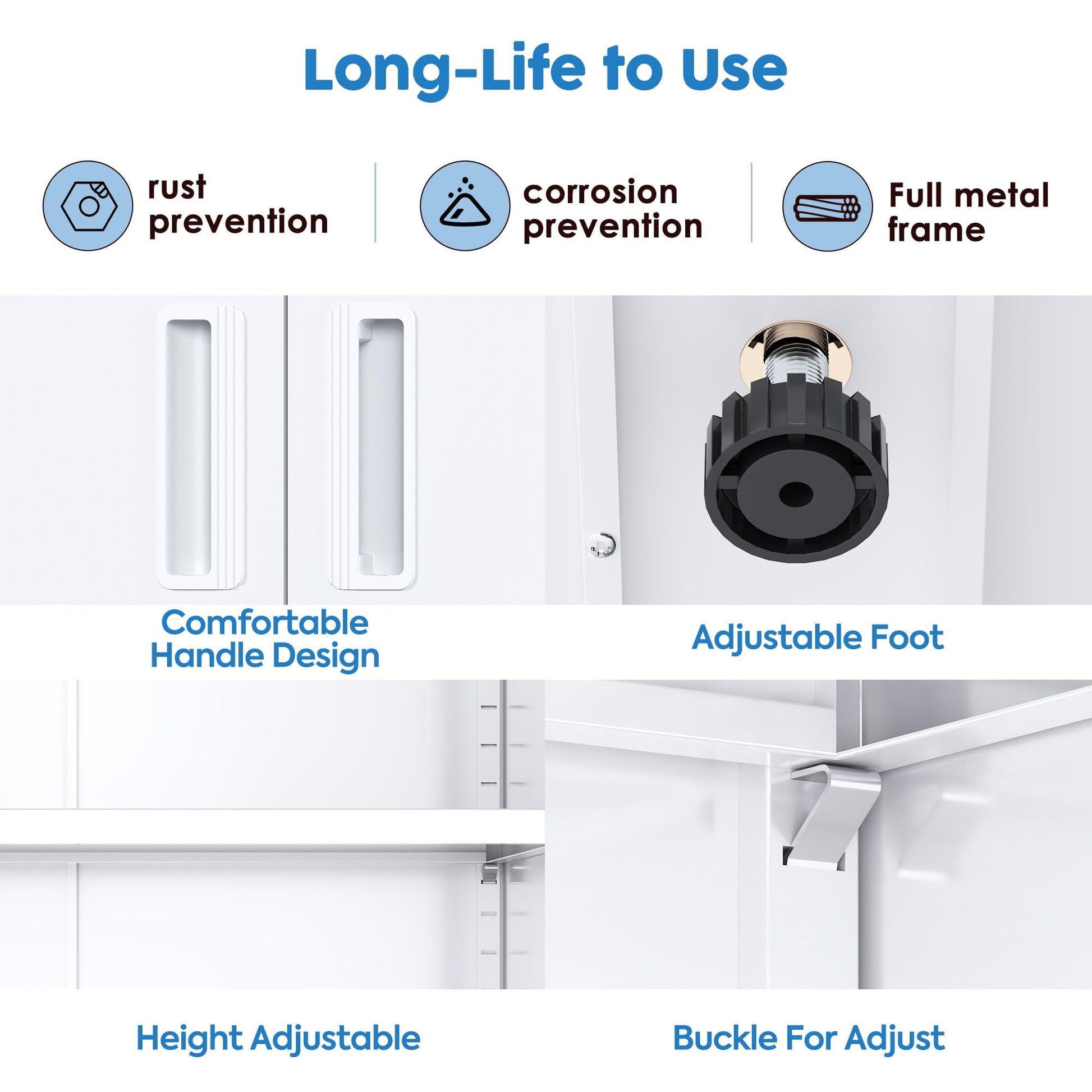 - 【Higher Quality Materials】The metal storage cabinet with 2 doors and 4 adjustable shelves has reinforced steel frame and stain resistant powder coat, which make it a perfect for long-term storage items.