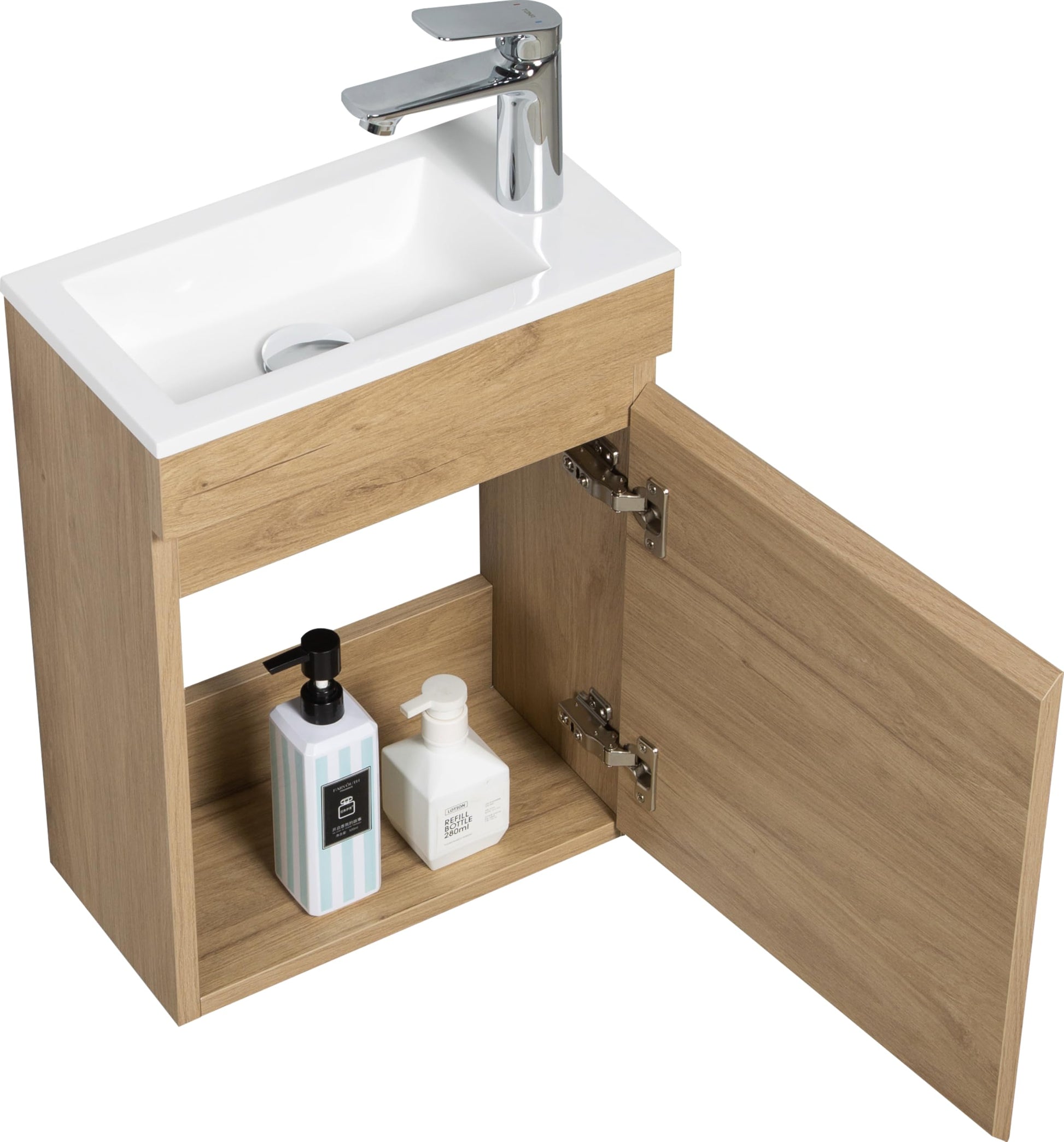 - Compact and Functional: Enhance your bathroom with this space-saving wall-mounted vanity, featuring a Natural Oak finish storage cabinet to neatly organize cosmetics and other essentials. Its modern, minimalist design elevates the aesthetic appeal of your space while maximizing functionality.