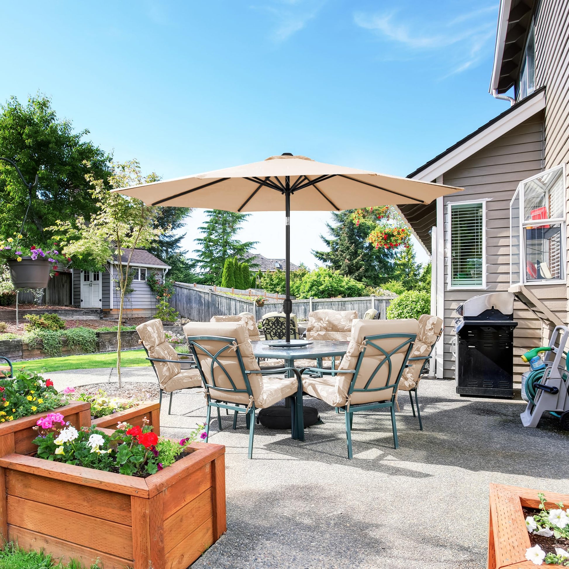 - Base Included: Our patio umbrella integrates a high-strength fabric sandbag base, uniquely designed to be filled with sand or gravel for umbrella stabilization. This durable, all-in-one solution eliminates the need for additional stand weights—offering unmatched convenience and reliability compared to standard market umbrellas requiring separate bases