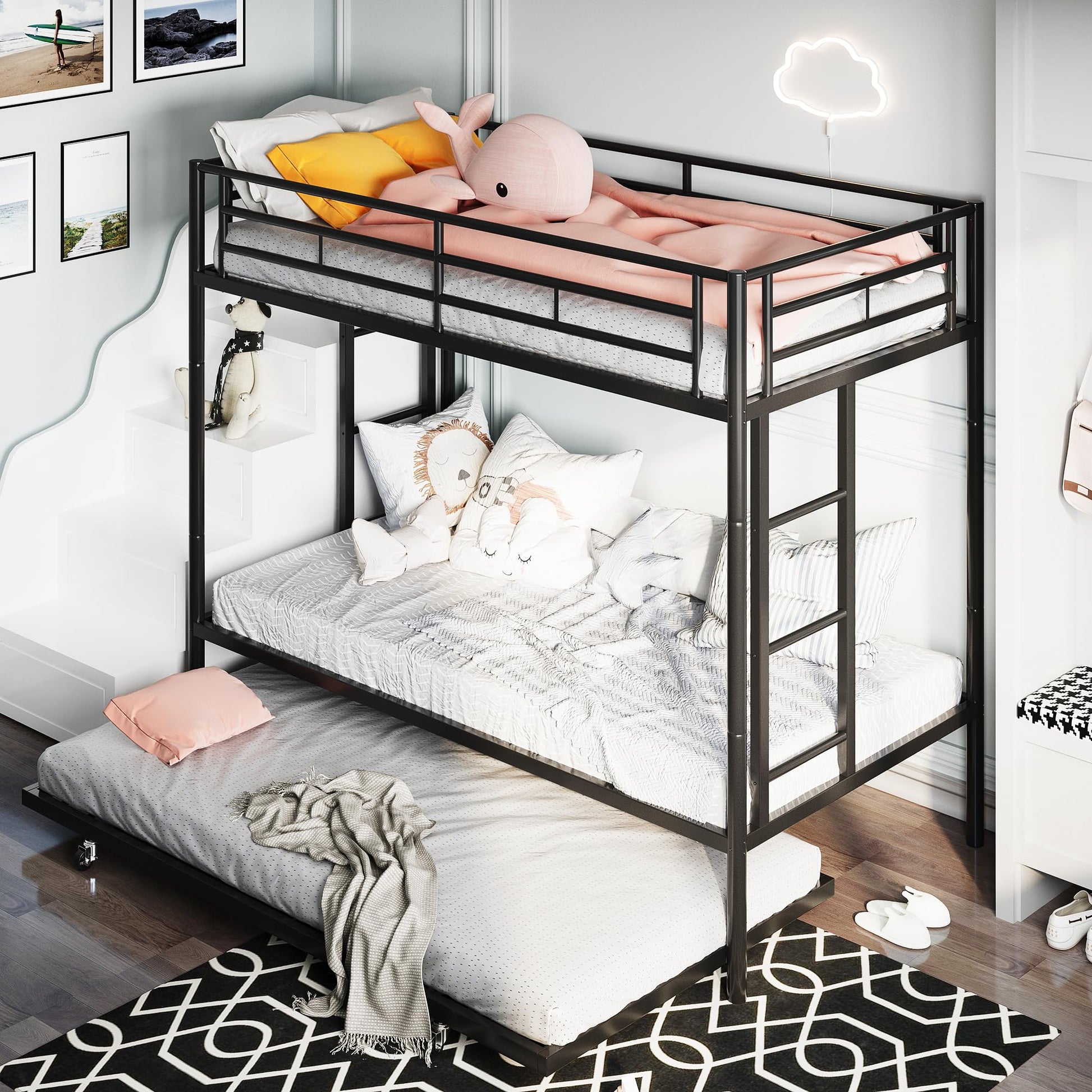 Metal Loft Bed with 2 Secured Ladders, Bunk Bed Twin Over Full with Trundle