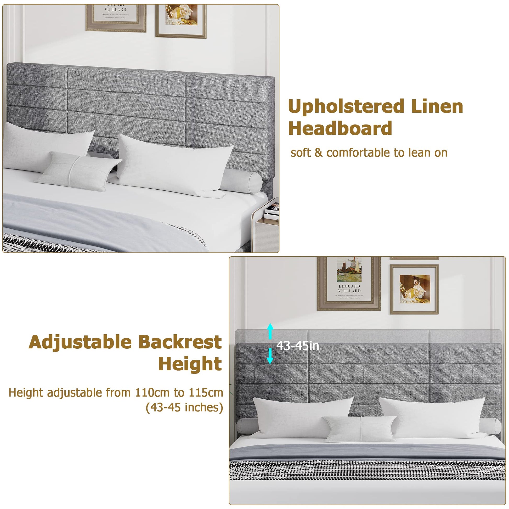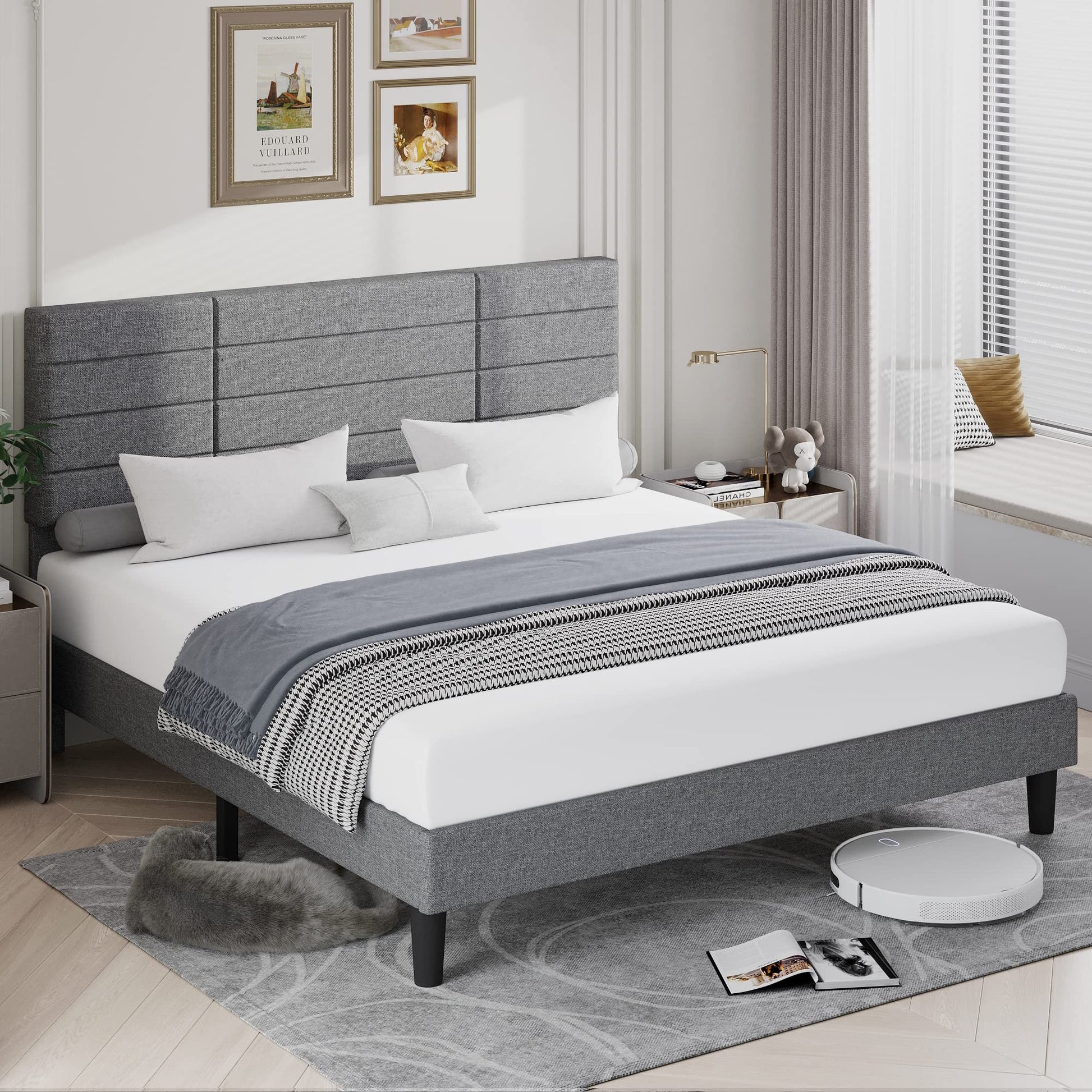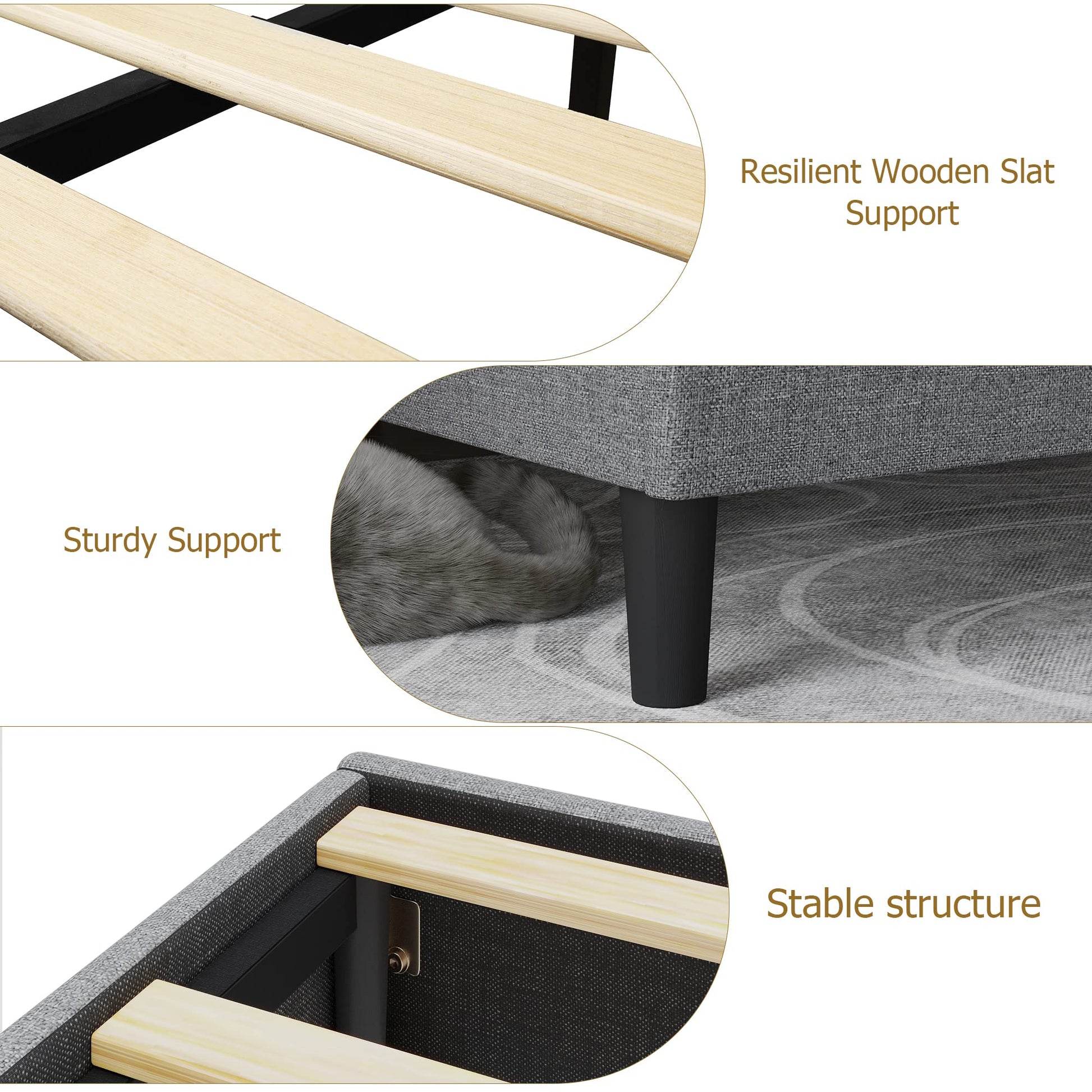 Bed Frame Queen Size Upholstered Platform Beds with Headboard Linen Fabric Wood