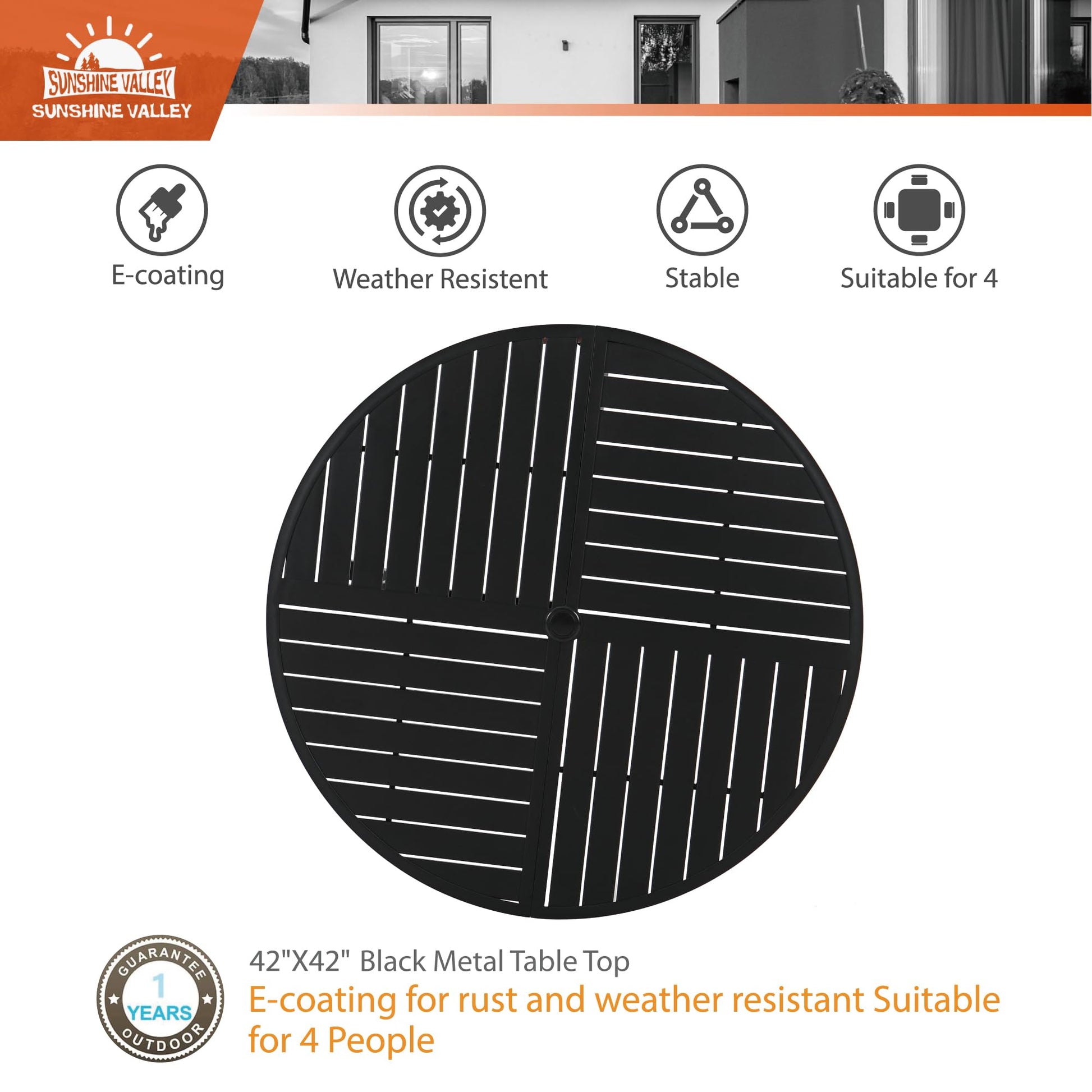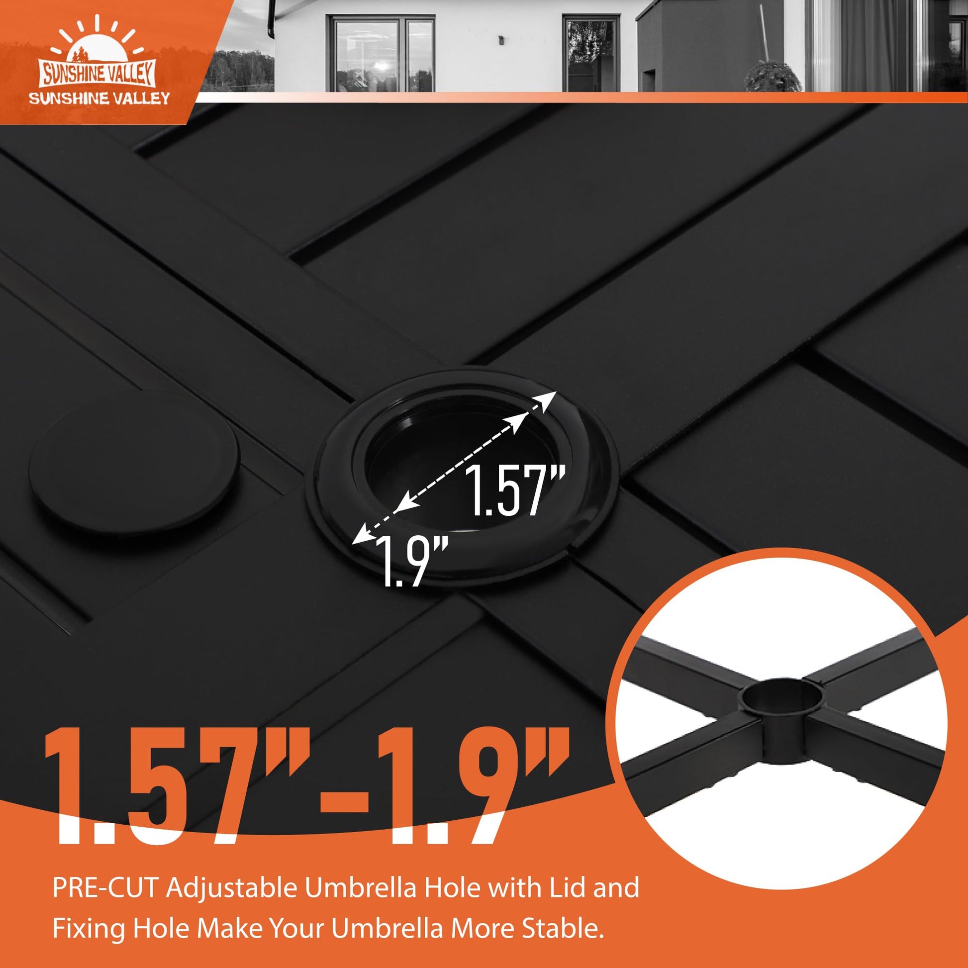 - This unique slatted tabletop design, with safe slat spacing, Not only makes it easy to remove water and food debris but also keeps your fingers safe. And with a 1.57-inch umbrella hole can be for 4 people, which is Perfect for family and friends.