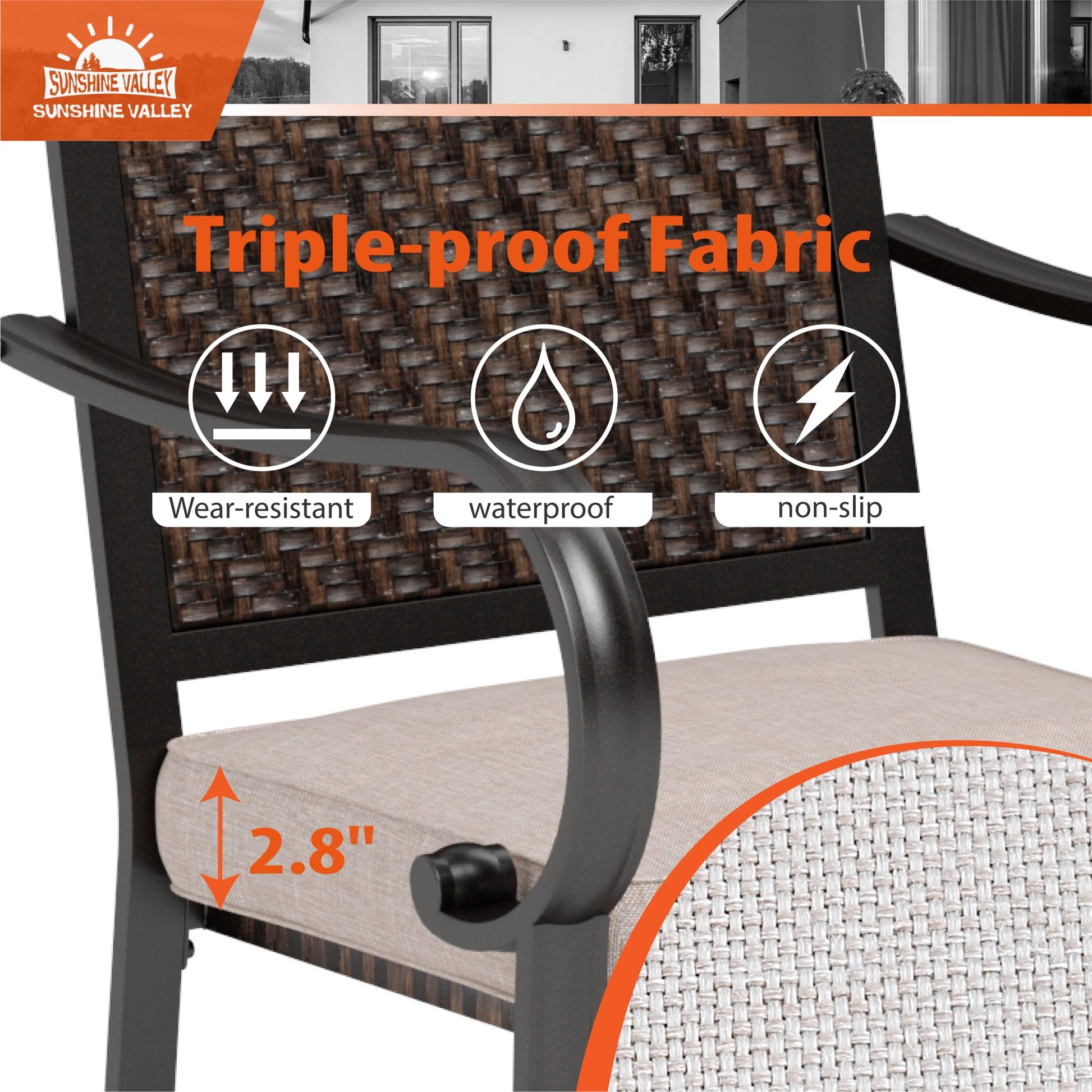 - This patio dining chair has an ergonomic backrest, curved armrests, and an all-weather 2.8" thick sponge-filled seat cushion, which can provide you with a comfortable sitting experience and is perfect for your outdoor leisure time with family or friends.