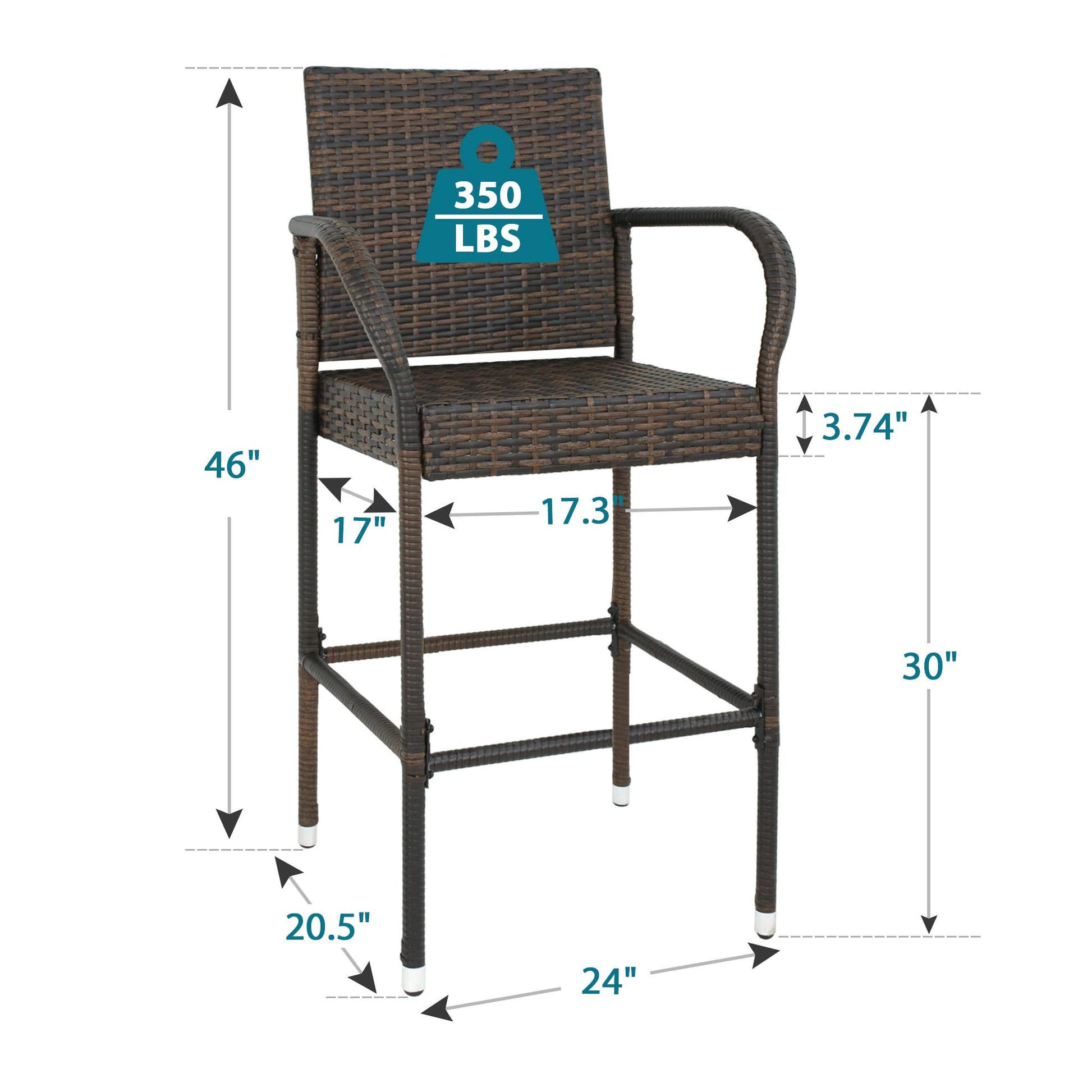 - ★ Dimensions: 24”(L) x 20.5”(W) x 46"(H); Chair total height: 46”; Bar stool seat height: 30"; Distance from foot tube to floor: 12.8". This pair rattan bar stool gather comfort and beauty. An excellent choice for any outdoor entertaining area. You can't go wrong with these barstools.