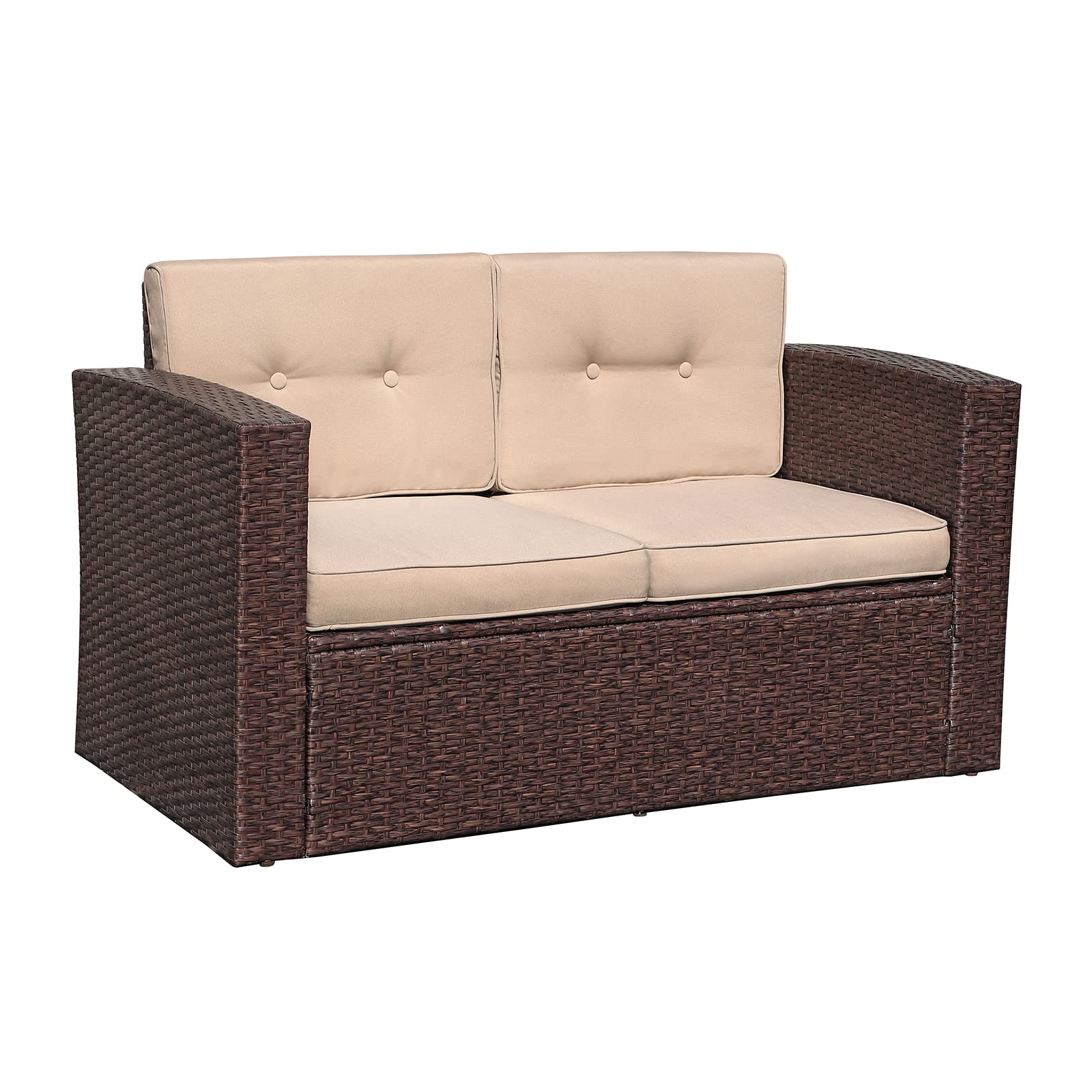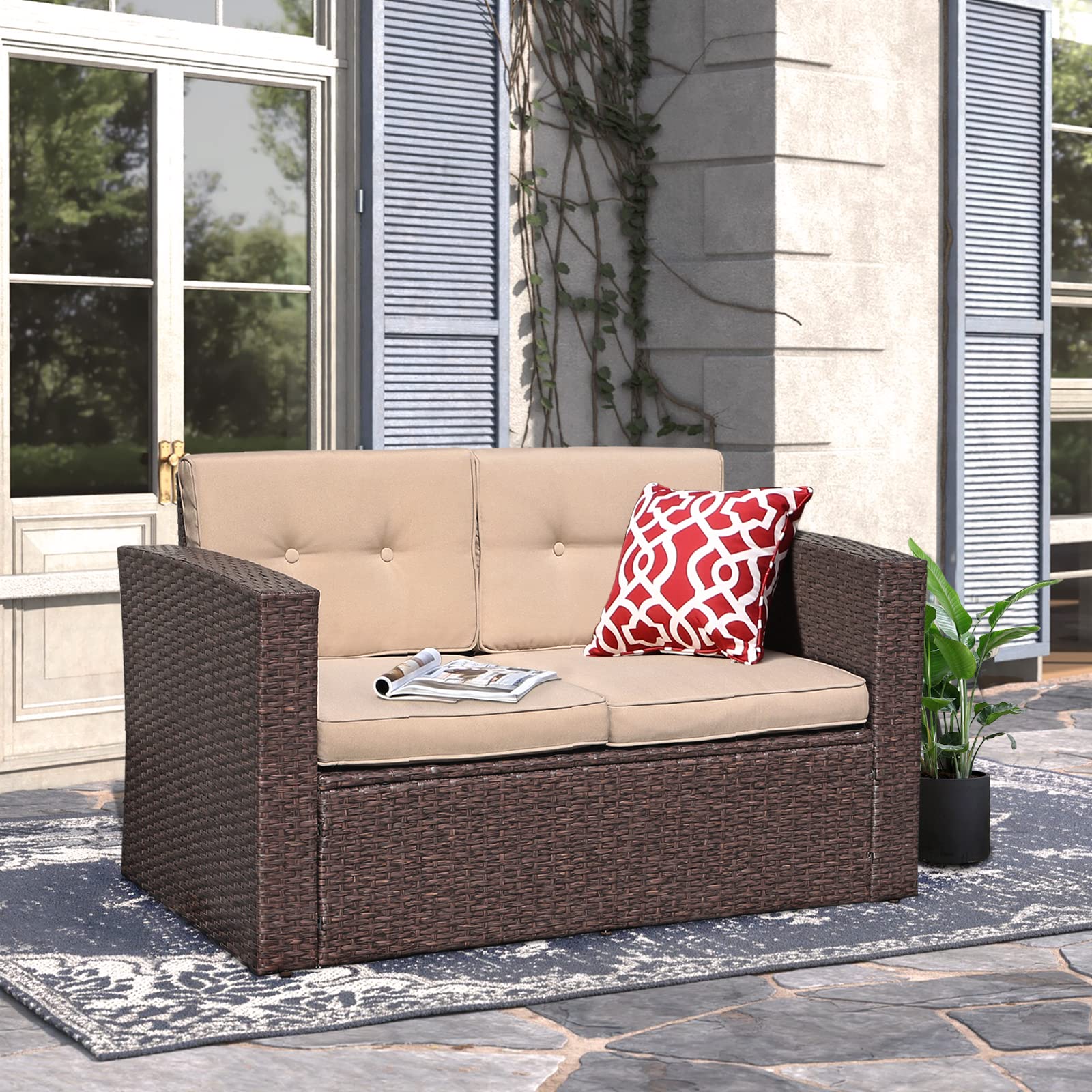 - Stylish Design: This loveseat combines classic espresso brown rattan with versatile beige fabric that is simple, stylish, and will not go out of style; it’s perfect for your yard, porch, backyard, balcony, poolside, garden and other outdoor space