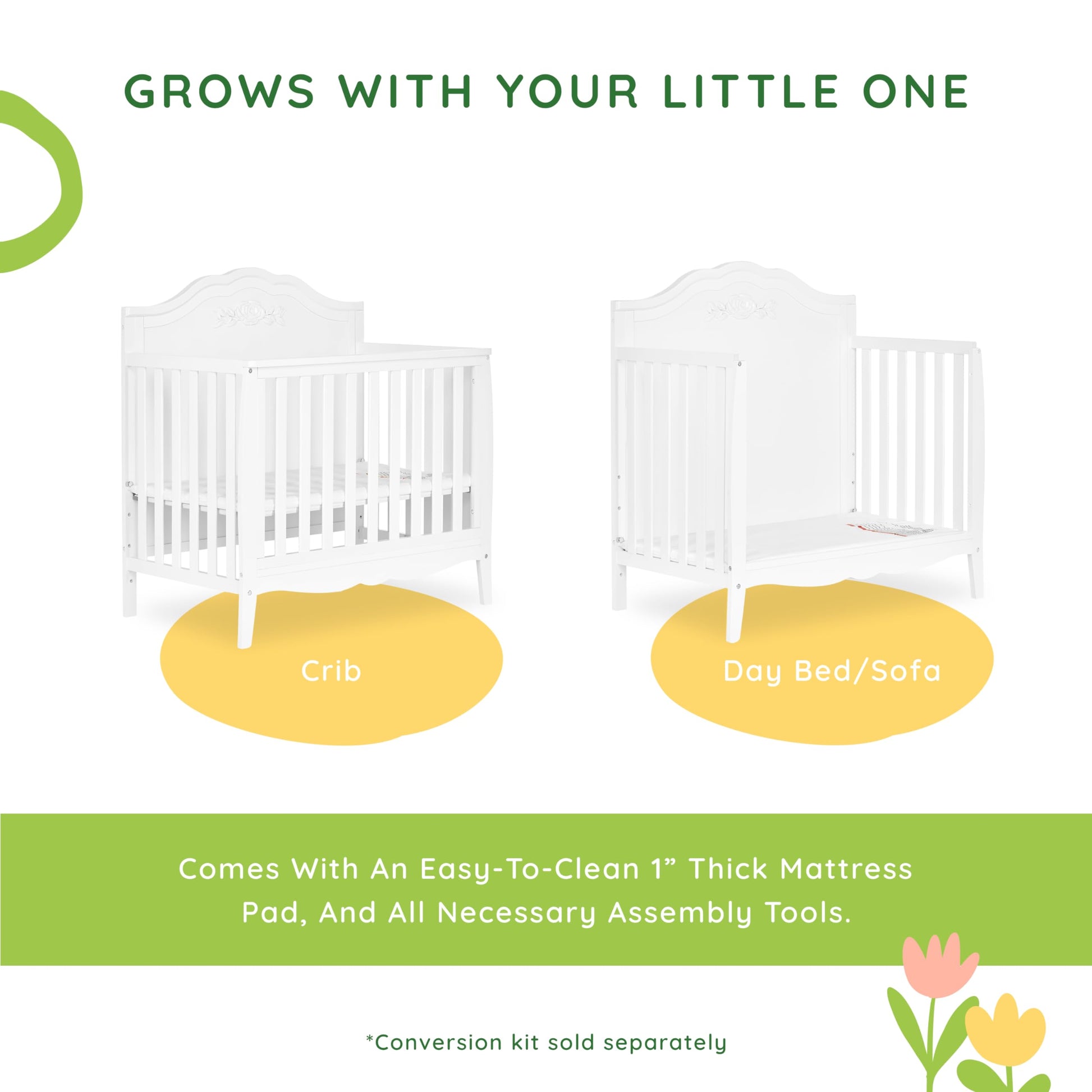 - KEEPS UP WITH YOUR LITTLE ONE: The compact Rose Convertible Mini Creasily converts to a daybed & twin-size bed (conversion kit sold separately).
